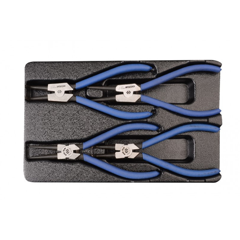 Склад ложемента: Знімач стопорних кілець зі зворотною пружиною прямою на стиск 180 мм Знімач стопорних кілець із поворотною пружиною гнутий на стиск 170 мм Знімач стопорних кілець зі зворотною пружиною прямою на розтиск 180 мм. Знімач стопорних кілець із поворотною пружиною гнутий на розтиск 170 мм