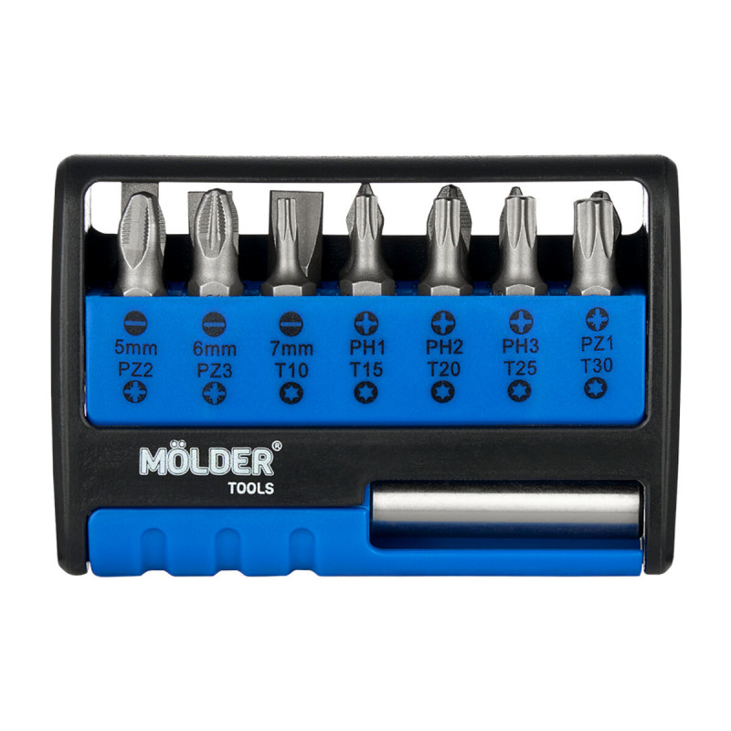 Набір біт з магнітним тримачем MOLDER 25 мм (15 шт) — універсальний набір для виконання широкого спектра монтажних робіт. До комплекту входять біти популярних типів: шліцьові, хрестові, Pozidriv та Torx, а також зручний магнітний тримач для швидкої заміни біт під час роботи.