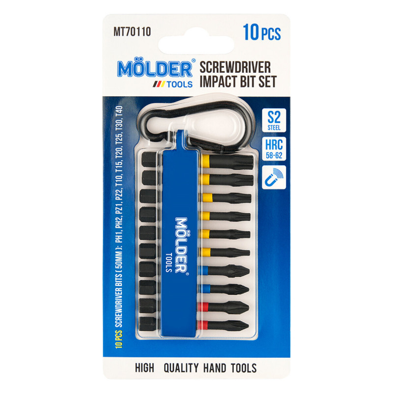 Набір ударних біт MOLDER 50 мм (10 шт, кольорове маркування) — професійний комплект, розроблений для використання з ударними шуруповертами та гайковертами. Біти мають підвищену міцність, стійкість до деформацій та довговічність завдяки спеціальному загартуванню та матеріалу S2.
