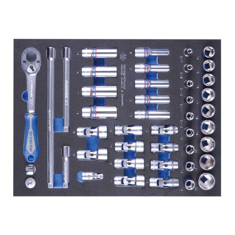 Набір з інструментом торгової марки KING TONY включає торцеві головки та приладдя, призначений для монтажу та демонтажу кріпильних вузлів різних виробів, пристроїв і агрегатів. Матеріал ложементу - EVA (ЕВА, етиленвінілацетат). При своїй легкості, цей матеріал володіє високими характеристиками міцності, стійкістю до масел і розчинників, при деформації повертає колишню форму. Склад набору Головка торцева стандартна шестигранна 3/8", KING TONY серії 3335M 10, 11, 12, 13, 14, 15, 16, 17, 18, 19, 20, 21, 22 Головка торцева TORX Е-стандарт 3/8", L=28 мм KING TONY серії 3375M E7, E8, E10, E11, E12 Головка торцева глибока дванадцятигранна 3/8", KING TONY 3230M 8, 10, 11, 12, 13, 14, 16, 17, 19 Головка 3/8" торцева з шарніром, KINGTONY серії 3750M 10, 11, 12, 13, 14, 15, 16, 17, 18, 19 Подовжувач 3/8", KING TONY серії 3221 75, 150, 250 Подовжувач 3/8", 36 мм, 15 градусів, з кульовим закінченням KING TONY 3223-14 Перехідник 3/8">1/4" KING TONY 3812 Перехідник 3/8">1/2" KING TONY 3814 Тріскачка 3/8", 200 мм, 32 зубці, прапорцева, фіксатор KING TONY 3779-08G