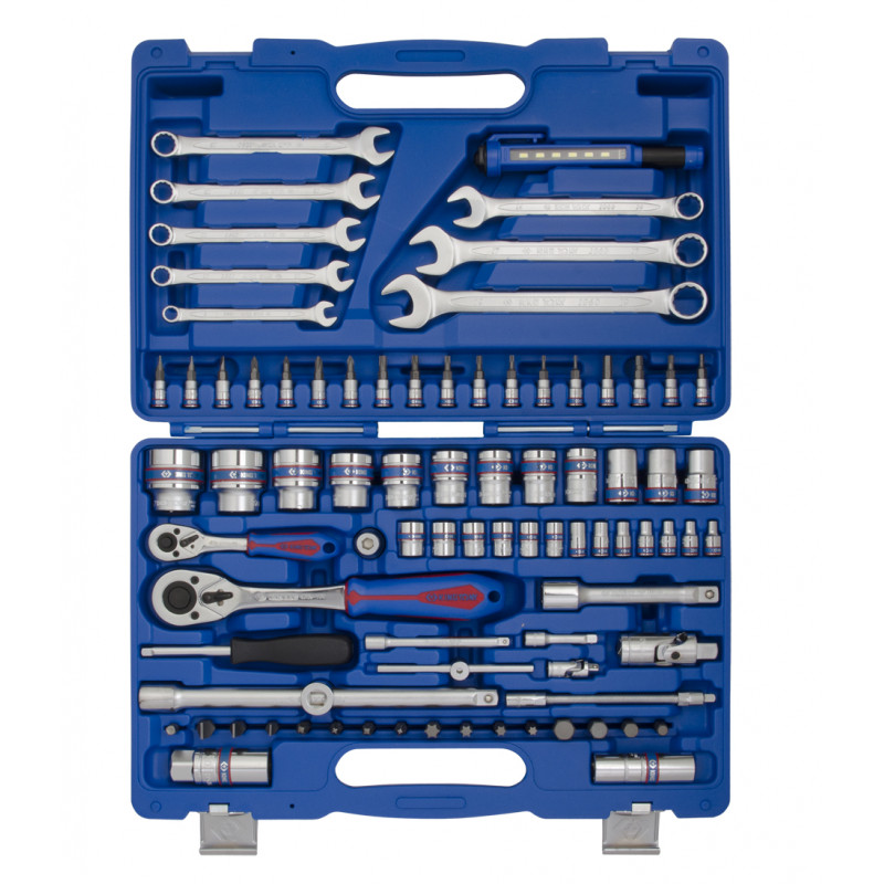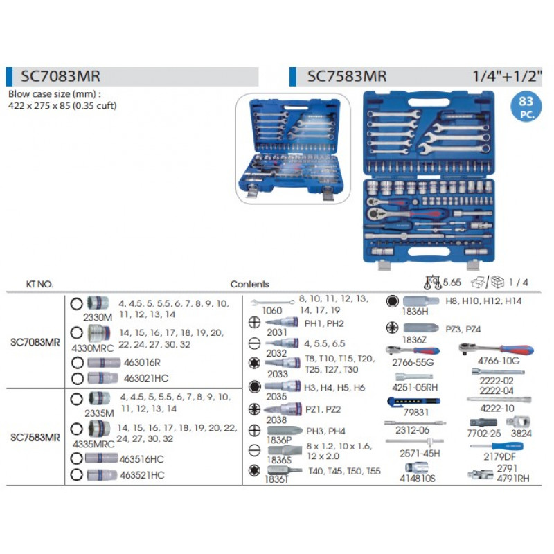 Універсальний набір інструментів 1/4"+1/2" 83ін. KINGTONY SC7583MR Універсальний набір інструментів підібраний таким чином, щоб догодити власникам автотранспортних засобів та майстрам на СТО. Комплект з 83 аксесуарів призначений для розбирання або збирання вузлів та механізмів двигуна, трансмісії, ходової частини та елементів кузова. Інструмент підходить для відновлення українських та імпортних автомобілів. Такі інструменти корисні в гаражі чи багажнику машини. Для автомобіліста набір буде затребуваним подарунком. Набір представлений на ринку у пластиковому кейсі, що забезпечує цілісність інструменту при зберіганні чи транспортуванні. Гідність валізки з ручкою – наявність форм під інструмент усередині. Власник, перед закриттям кейсу, легко визначить, якого аксесуару не вистачає і усуне нестачу на місці. Легована інструментальна сталь, з якої виготовлений інструмент у наборі, гарантує власнику відмовостійкість у роботі. На інструменті є маркування заводу-виробника, що підтверджує оригінальність продукції. Ключі, насадки, біти та подовжувачі зроблені з одного матеріалу, тому міцні та довговічні. Навіть світлодіодний ліхтарик, виготовлений на основі пластику, виконаний у захисному корпусі. Склад набору: Ключі комбіновані: 8, 10, 11, 12, 13, 14, 17, 19мм. Головки 6-ти грані з посадкою 1/4": 4, 4.5, 5, 5.5, 6, 7, 8, 9, 10, 11, 12, 13, 14мм. Головки 6-ти грані з посадкою 1/2": 14, 15, 16, 17, 18, 19, 20, 22, 24, 27, 30, 32мм Біта в насадці під 1/4" ФІЛІПС: PH1, PH2. Біта в насадці під1/4" ШЛИЦ: SL4, SL5.5, SL6.5 Біта в насадці під 1/4" Torx: T8, T10, T15, T20, T25, T27, T30 Біта в насадці під 1/4" Hex: H3, H4, H5, H6 Біта в насадці під 1/4" Pozidriv: PZ1, PZ2 Свічкові головки 6-ти грані: 16мм, 20,8мм. Кардан 1/4" та 1/2" Подовжувач 1/4" - 2шт. Подовжувач 1/2" - 2шт. Подовжувач гнучкий - 1шт. Біти: SL8x1.2, SL10x1.6, SL12x2.0, PZ3, PZ4, PH3, PH4, T40, T45, T50, T55, H8, H10, H12, H14 Адаптер для біт 1/4" та 1/2. Тріскачка під 1/4" та 1/2" Вороток ковзний - 1шт. Перехідник із 3/8"Fx1/2"M -1шт. Вороток викруту для біт -1шт Ліхтарик LED 3W - 1шт.