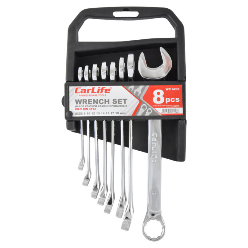 Набір ключів комбінованих CarLife WR4208 — універсальний інструмент широкого застосування. З одного боку знаходиться ріжковий ключ з відкритим зівом, з іншого — накидний ключ того ж розміру. Використовується для створення різьбових з'єднань, а також демонтажу: відкручування гайок і болтів. Тому комбінований ключ ще можуть називати «ріжково-накидний». Даний вид гайкових ключів є найбільш затребуваним і поширеним.