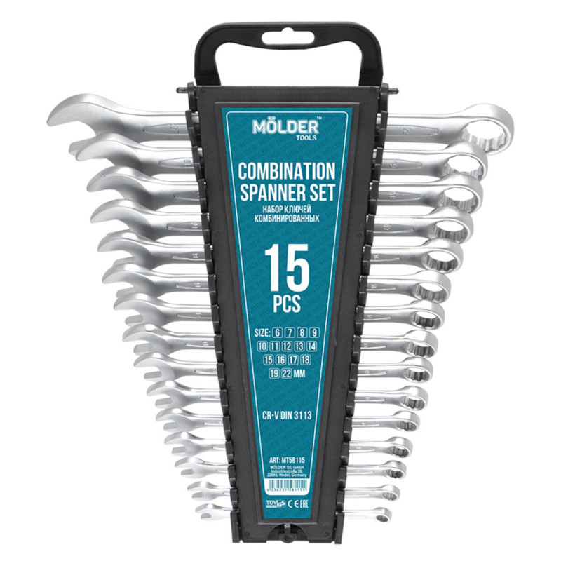 Набір MOLDER MT58115 складається з 15-ти комбінованих ключів для загвинчування/відгвинчування різьбових з'єднань, що мають зовнішній профіль. Рожкові головки добре підходять для роботи з не надто затягнутими болтами та гайками, а також у місцях, де зверху над кріпленням простір обмежений і є лише бічний доступ. Кільцеподібна форма накидних головок дозволяє передавати значні моменти, що крутять, на кріплення. За рахунок замкнутої конструкції, головкам нікуди зіскочити, що дає можливість демонтувати сильно затягнуті або заржавілі кріпильні з'єднання.