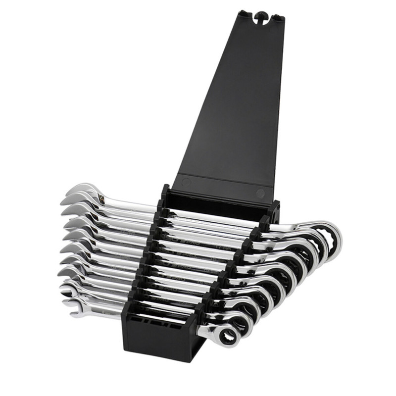 У набір входять 10 комбінованих ключів, які охоплюють найпопулярніші розміри: 8, 10, 12, 13, 14, 15, 17, 19 мм. Ключі оснащені механізмом тріскачки, що значно полегшує роботу з кріпленнями. Усі інструменти виготовлені з високоякісної хром-ванадієвої сталі (CR-V), яка забезпечує їхню міцність і довговічність. Компактний пластиковий кейс дозволяє зручно зберігати інструменти та швидко знаходити потрібний ключ.
