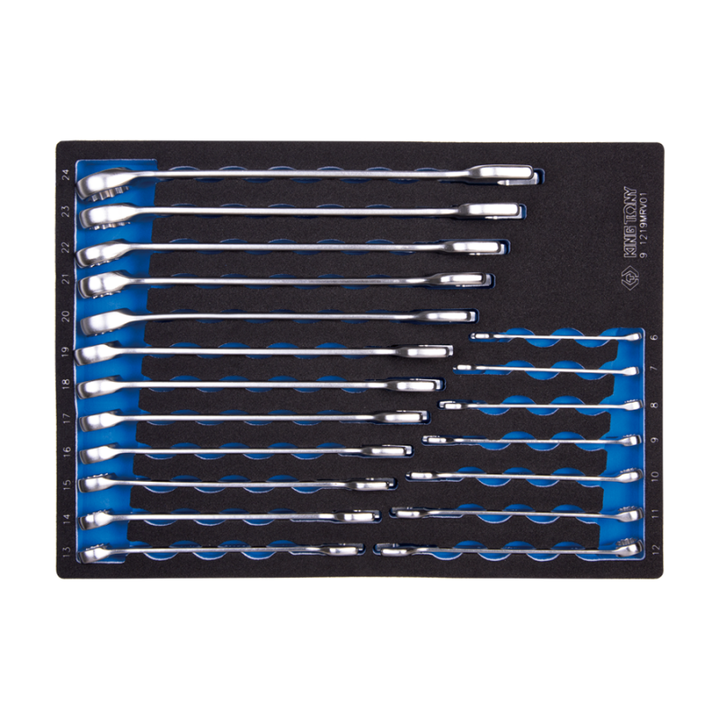 Набір комбінованих ключів у ложементі King Tony (9-1219MRV01) – це комплект слюсарної оснастки для роботи з елементами кріплення. Орієнтований набір на професійне використання автосервісу. Ложемент EVA FOAM, розміром 375х280 мм, випускається під ящики інструментальних візків та верстатів. Комплект може використовуватися спільно з іншим оснащенням із системи зберігання інструменту, або як самостійна одиниця. Купити набір комбінованих метричних ключів для автосервісу Особливість набору в універсальності. Маючи ключі затребуваних розмірів (від 6 до 24 мм), можна обслуговувати будь-який вид кріплення. Станції ТО, будівництво, виробництво, енергетичний сектор, меблева справа. Функціональність набору не обмежена. Матеріал виготовлення ключів – хромованадієва сталь. Оздоблення – хромування, полірування. Комбінація ключа – 6-гранний ріжок та 12-гранне накидне кільце. Головки ключа мають нахил 15 градусів (щодо рукоятки). Зроблено це для зручності хвату гайки або болта, розташованого у важкодоступному місці.