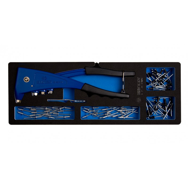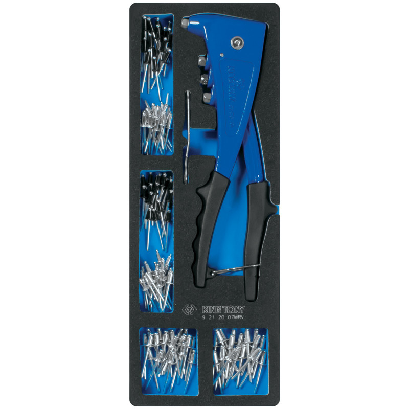 Заклепочник з набором заклепок King Tony 9-21-20-07MRV в ложементі EVA (ЕВА, полімер на основі етилену та вінілацетату) із 121 предмета, призначений для надійного скріплення матеріалів алюмінієвими заклепками. Комплектація ложемента: Заклепочник 260 мм Заклепки алюмінієві 4х8 мм, чорні 20 шт. Заклепки алюмінієві 4х8 мм 20 шт. Заклепки алюмінієві 4х10 мм, чорні 20 шт. Заклепки алюмінієві 4х10 мм 20 шт. Заклепки алюмінієві 4.8 8 мм 20 шт. Заклепки алюмінієві 4.8 10 мм 20 шт. Розмір ложемента: 375 х 140 мм Вага нетто 0,9 кг.