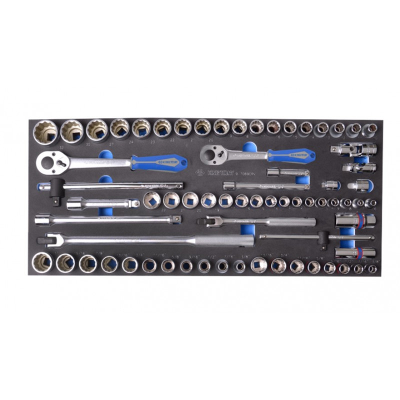 Набір торцевих головок 1/2" та 3/8" 70 предметів (EVA ложемент) King Tony 9-7069CRV – це комплект слюсарного приладдя для слюсарних робіт. Призначений для роботи з елементами кріплення за будь-яких умов. Набір включає: · Воротки.· Тріскачки.· Подовжувачі, кардани та перехідники.· Торцеві головки під найбільш популярні посадочні квадрати (1/2" та 3/8").· Ложемент EVA для ящиків Кінг Тоні. Купити набір торцевих головок із комірами King Tony – найкраща ціна Особливість інструменту у зручній комплектації. Набір підійде для автосервісу, будівництва, виробництва, сервісних центрів, побутових завдань. Це універсальний комплект інструменту, для роботи з яким не потрібні супутні пристрої. Слюсарне оснащення в наборі виготовлене з легованої хромованадієвої сталі. Металевий корпус має захисне хромоване покриття. Рукоятки тріскачок прогумовані. Усі торцеві головки в наборі мають 12-гранну посадку під елемент кріплення. У комплект входять метричні та дюймові торцеві головки, що додає універсальності всьому набору інструменту.