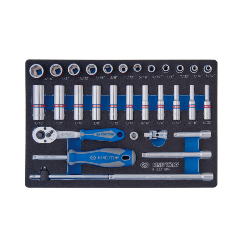 Набір торцевих головок з приладдям 1/4", шестигранні, 5/32"-9/16", 31 предмет Головки та приладдя 1/4" Головка торцева стандартна 6-гранна 2335S 5/32", 3/16", 7/32", 1/4", 9/32", 5/16", 11/32", 3/8", 7/16 ", 15/32", 1/2", 9/16" Головка торцева глибока 6-гранна 2235S 5/32", 3/16", 7/32", 1/4", 9/32", 5/16", 11/32", 3/8", 7/16 ", 1/2", 9/16" Тріскачка прапорцева 2771-55G 24 зубці, 140 мм Вороток ковзний 2571-45 115 мм Викрутка воріт 2178DF 150 мм Подовжувач 2221-02 50 мм Подовжувач 2221-04 100 мм Подовжувач 2221-06 150 мм Кардан 2792 36 мм Тримач вставок (біт) 1/4" 2142 25 мм Упаковка Пластиковий (PP) футляр 820001 289 x 230 x 66 мм Ложемент EVA – 280 x 187 мм Матеріали: сталь Cr-V, хром, гума TPR, EVA (ложемент), пластик ABS Вага: 1,7 кг Призначення Передача крутного моменту від інструменту на кріплення, монтаж/демонтаж посаджених гайок та болтів. Особливості Набір укомплектований торцевими головками розмірністю дюймового стандарту: розміри виражені частинами частин дюйма. Дюймовий стандарт розмірів використовується у техніці американського виробництва. Розмір ложементу адаптований як для мобільного використання (у футлярі для зберігання та перенесення), так і для стаціонарного розміщення на полиці інструментального візка (варіант без футляра). Футляр із пластику марки ABS виготовлений та адаптований з урахуванням можливості пакетного розміщення в умовах складського зберігання чи експлуатації. Матеріал ложемента - EVA - легкий, міцний, еластичний і пружний матеріал, що володіє хорошими властивостями, що амортизують, стійкий до олій і розчинників, при деформації повертає колишню форму. EVA (ЕВА, полімер на основі етилену та вінілацетату) – матеріал, що не має рівних за своїми характеристиками та задовольняє умов інтенсивної експлуатації в умовах щоденної роботи. Галузь застосування Станції технічного обслуговування (СТО), автосервіси, автомайстерні, виробництво, побутове застосування. Інструмент KING TONY • Виготовлений із високоміцної легованої хром-ванадієвої інструментальної сталі; • Хромоване покриття захищає інструмент від корозії; • Ергономічні ручки інструментів, стійкі до дії масел, бензину, кислот та лугів; • Для надання торцевим головкам особливої міцності, в процесі виготовлення застосовано метод кування, що надає інструментам особливої міцності. Якість Відповідає вимогам міжнародного стандарту ANSI/ASME B107.1 Гарантія На ключі, торцеві головки та інший силовий інструмент поширюється довічна гарантія, що дає можливість застосування інструменту KING TONY у професійних цілях.