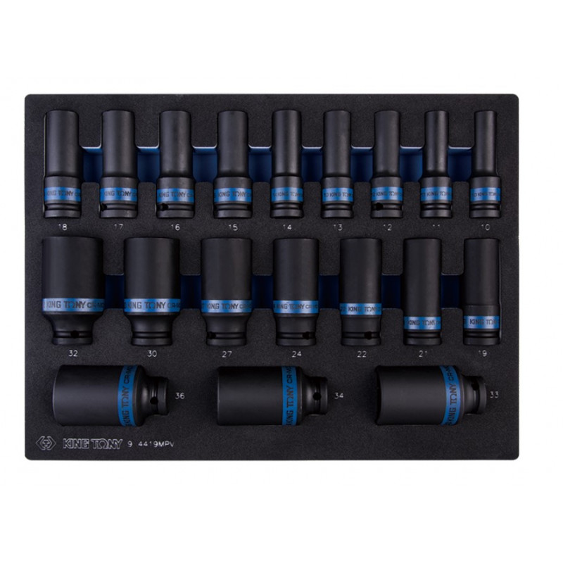 Набір торцевих головок 1/2" ударних довгих King Tony (9-4419MPV) – це комплект зі змінних насадок під інструмент, призначений для обслуговування елементів кріплення. Використовується для відкручування або закручування гайок, болтів, гвинтів, що мають 6-гранну головку. в тому, що розрахована вона на ударні навантаження, з такими головками зручно зірвати різьбу, що прикипіла або заржавіла, і виконати потужну затяжку по різьбленні. Купити набір ударних головок Кінг Тоні – найкраща ціна Комплект насадок орієнтований на автосервіс та виробництво. Постачається в ложементі EVA та розрахований на оснащення ящиків інструментальних візків розміром 579х380 мм. Набір ударних головок може бути придбаний для компонування систем зберігання інструменту, або використовуватися окремо. У комплект входять довгі ударні головки: 10, 11, 12, 13, 14, 15, 16, 17, 18, 19, 21, 22, 24, 27, 30, 32, 33, 34, 36 мм. Виготовлений інструмент із хромомолібденової сталі, захисне покриття – фосфатний потоплений. Торцеві головки можна використовувати з комірами, тріскачками і гайковертами. Для останнього інструменту передбачена канавка та отвір під кульки.