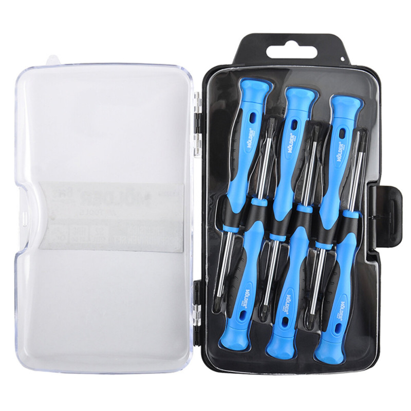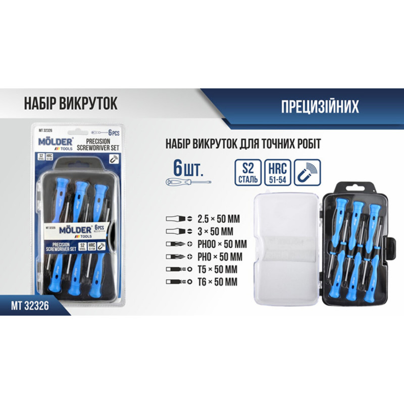 Набір викруток для точних робіт Molder, 6 шт, S2, HRC 51-54, намагнічений наконечник, двокомпонентна ручка.Якісний і надійний інструмент, відмінний вибір для роботи. Виготовлений з високоякісних матеріалів. Ергономічна рукоятка дозволяє максимально ефективно утримувати викрутку в руках, не витрачаючи додаткових зусиль при роботі.