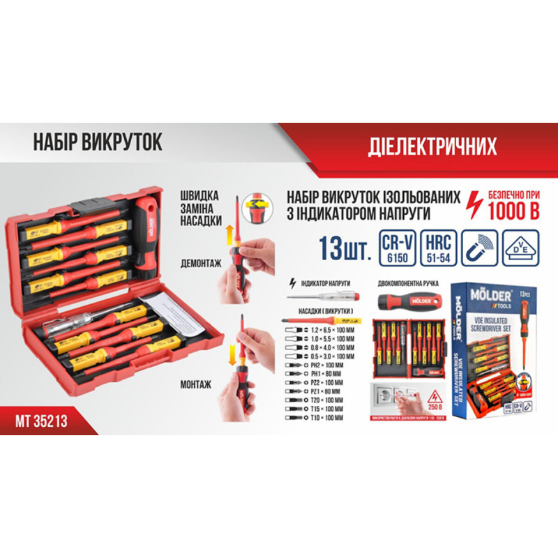 Набір викруток ізольованих з індикатором напруги Molder, VDE 1000 В, 13 шт.(SL1.0x5.5x100mm, SL0.8x4.0x100mm, SL1.2x6.5x100mm, SL0.5x3.0x100mm, PH1x80mm, PH2x100mm, PZ2x100mm, PZ1x80mm, T20x100, T15x100, T10x100mm, індикатор напруги), Cr-V 6150, HRC 51-54, намагнічений наконечник, двокомпонентна ручка.Якісний і надійний інструмент, відмінний вибір для роботи. Виготовлений з високоякісних матеріалів. Ергономічна рукоятка дозволяє максимально ефективно утримувати викрутку в руках, не витрачаючи додаткових зусиль при роботі.