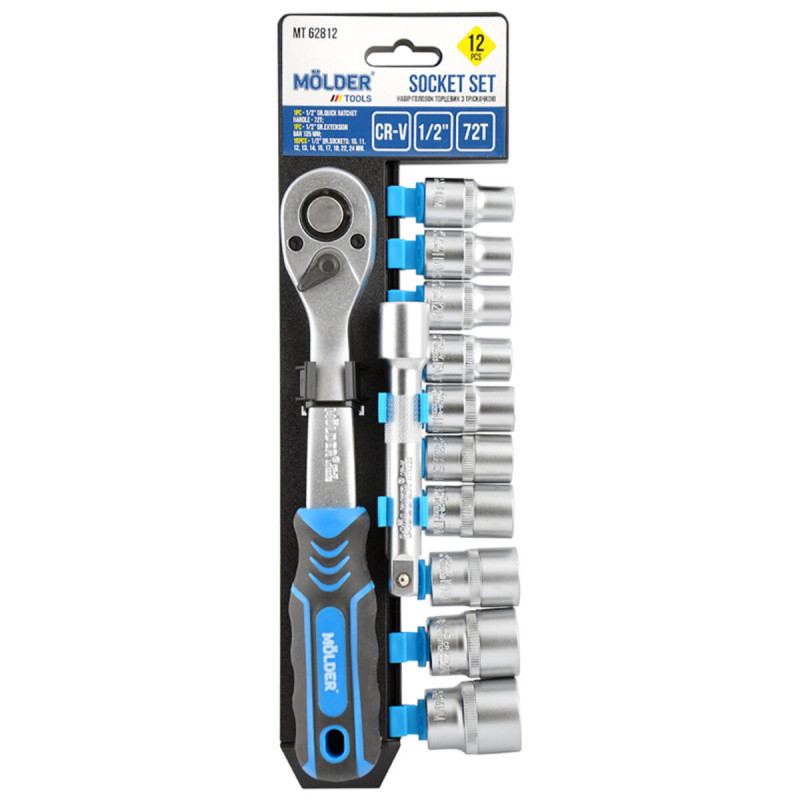 Набір головок з тріскачкою Molder MT62812 являє собою насадку для ручних інструментів, а саме воротки, тріскачки або механізовані інструменти, такі як гайковерт. Ця насадка підходить для демонтажу або монтажу різьбових з'єднань із зовнішнім профілем, такі як болти і гайки. Компанія Molder - лідер з виробництва інструментів і комплектуючих в Україні, який має широкий вибір, найкращу якість та доступну цінову політику. До складу комплектуючих входить хром-ванадієва сталь найкращої якості маркування CrV, за рахунок якої головки не деформуються при високо інтенсивному навантаженні під час роботи, продовжуючи термін служби на довгі роки. Набір головок з тріскачкою Molder MT62812 має форму профілю шестигранник.