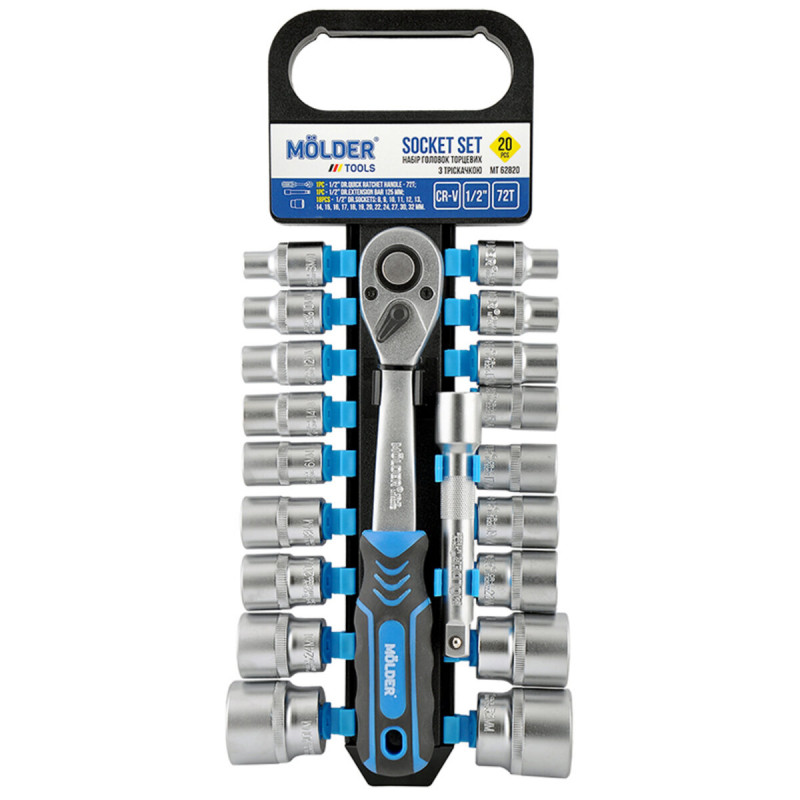 Набір Molder MT62820 складається з 20 інструментів, серед яких 18 торцевих головок, подовжувач і тріскачка. Набір призначений для закручування/відкручування різьбових з'єднань із зовнішнім шестигранним профілем. Усі складові є професійними, за рахунок чого підійдуть для експлуатації в автосервісі або на виробництві за умов підвищених навантажень.