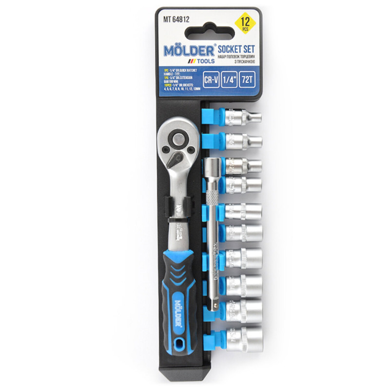 Професійний набір головок торцевих з тріскачкою та подовжувачем Molder CR-V 1/4" 72Т, 4-13мм (12шт)