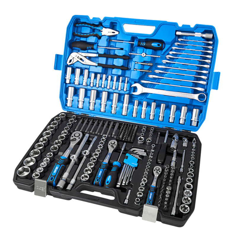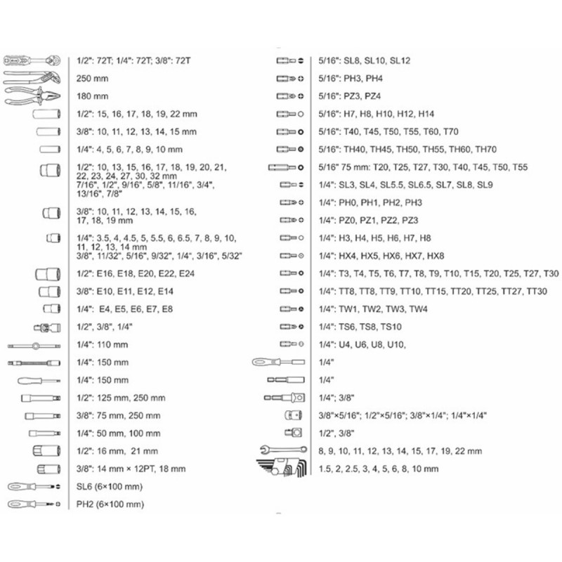 В комплекті:Трещоточна рукоятка 1/2", 72 зуби, реверсійна;Головка шестигранна торцева 1/2", 15 шт.: 10, 13, 15, 16, 17, 18, 19, 20, 21, 22, 23, 24, 27, 30, 32 мм;Головка дюймова 1/2", 8 шт.: 7/16", 1/2", 9/16", 5/8", 11/16", 3/4", 13/16", 7/8" ;Подовжена головка шестигранна 1/2", 6 шт.: 15, 16, 17, 18, 19, 22 мм;Головка E-тип (Torx) 1/2", 5 шт.: E16, E18, E20, E22, E24;Головка свічкова 1/2", 2 ш.: 16, 21 мм;Подовжувач 1/2", 2 шт.: 125 та 250 мм;Кардан 1/2";Перехідник 1/2";Адаптер для біт 1/2”.Трещоточна рукоятка 3/8", 72 зуби, реверсійна;Головка шестигранна торцева 3/8", 10 шт.: 10, 11, 12, 13, 14, 15, 16, 17, 18, 19 мм;Головка E-тип (Torx) 3/8", 4 шт.: E10, E11, E12, E14;Головка шестигранна подовжена 3/8", 6 шт.: 10, 11, 12, 13, 14, 15 мм;Головка свічкова, 3/8", 2 шт.: 14 мм (х12), 18 мм;Подовжувач 3/8", 2 шт.: 75, 250 мм;Кардан 3/8";Перехідник 3/8";Адаптер для біт 3/8".Трещоточна рукоятка 1/4", 72 зуби, реверсійна;Головка шестигранна торцева 1/4", 15 шт.: 3.5, 4, 4.5, 5, 5.5, 6, 6.5, 7, 8, 9, 10, 11, 12, 13, 14 мм;Головка дюймова 1/4", 7 шт.: 3/8", 11/32", 5/16", 9/32", 1/4", 5/32", 3/16";Головка E-тип (Torx) 1/4", 5 шт.: E4, E5, E6, E7, E8;Головка шестигранна подовжена 1/4", 7 шт.: 4, 5, 6, 7, 8, 9, 10 мм;Подовжувач 1/4", 2 шт.: 50, 100 мм;Кардан 1/4";Утримувач для біт 1/4", 150 мм;Гнучкий подовжувач 1/4";Вороток із плаваючою головкою 1/4", 110 мм;Адаптер для шуруповерта 2 шт: 1/4”x1/4”, 1/4”x3/8”;Викрутка із магнітом для біт;Утримувач для біт 1/4";Адаптер для шуруповерта з магнітом.Г-подібні шестигранні ключі, 9 шт.: 1.5, 2, 2.5, 3, 4, 5, 6, 8, 10 мм.Кліщі сантехнічні 250 мм;Плоскогубці 180 мм;Викрутка SL6, 100 мм;Викрутка PH2, 100 мм;Комбіновані ключі 11 шт.: 8, 9, 10, 11, 12, 13, 14, 15, 17, 19, 22 мм;Біти 75 мм:T40; T45, T50, T55, T60, T70;TT40, TT45, TT50, TT55, TT60, TT70;PH3, 4;PZ3, 4;SL8, 10, 12;HEX7, 8, 10, 12, 14.Біти 30 мм:FD3, FD4, FD5.5, FD6.5, FD7, FD8, FD9;PZ0, PZ1, PZ2, PZ3;PH0, PH1, PH2, PH3;Т3, Т4, Т5, Т6, Т7, Т8, Т9, Т10, Т15, Т20, Т25, Т27, Т30;TT8х2, TT9, TT10, TT15, TT20, TT25, TT27, TT30;H3, H4, H5, H6, H7, H8;H4, H5, H6, H7, H8 (з фіксатором);TW1, TW2, TW3, TW4;TS6, TS8, TS10;SL4, SL6, SL8, SL10.