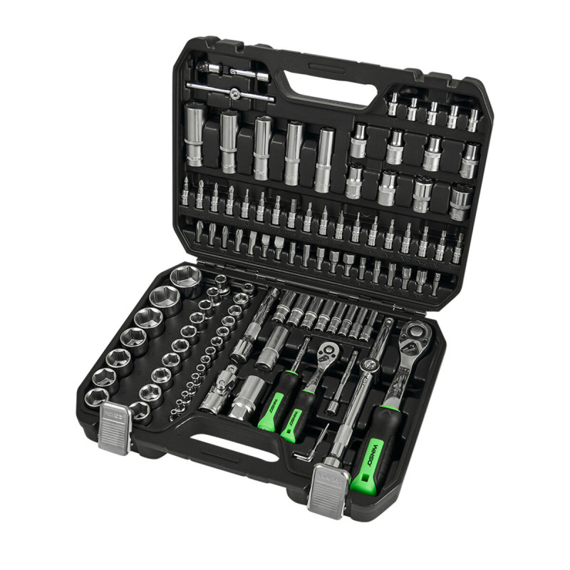 - Тріскачки (1/2", 1/4") з 72 зубцями — плавна точна робота у важкодоступних місцях, ергономічні прогумовані ручки.