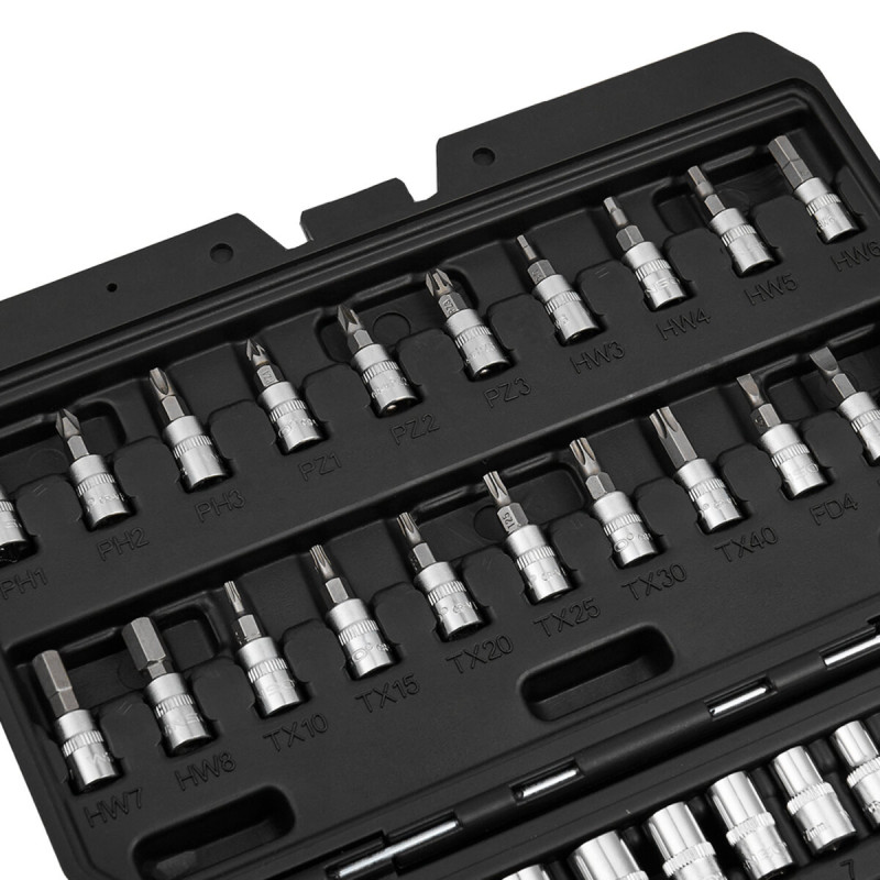 - Торцеві головки (1/4"): виготовлені з високоякісної хром-ванадієвої сталі (CR-V). Покривають розміри від 4 мм до 14 мм, забезпечуючи універсальність у роботі.