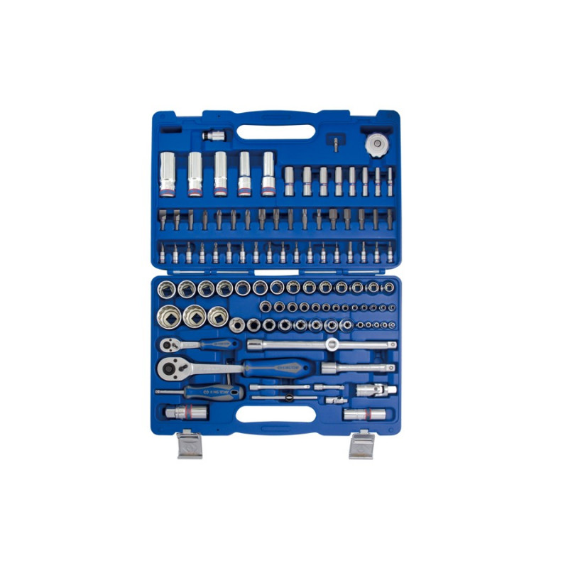 · Головка торцева 1/4" (4, 4.5, 5, 5.5, 6, 7, 8, 9, 10, 11, 12, 13, 14 мм).· Торцева головка довга 1/4" (6, 7, 8, 9, 10, 11, 12, 13 мм).· Головка торцева 1/4" (Е4, Е5, Е6, Е7, Е8).· Головка з насадкою HEX 1/4" (3, 4, 5, 6 мм).· Торцева головка з насадкою TORX 1/4" (T8, T10, T15, T20, T25, T30).· Головка із шліцевою насадкою 1/4 (4, 5.5, 6.5 мм).· Головка з насадкою PH 1/4" (PH1, PH2).· Насадка PZ 1/4 (PZ1, PZ2).· Головка торцева 1/2 (10-24, 27, 30, 32 мм).· Головка торцева довга 1/2 (14, 15, 17, 19, 22 мм).· Головка торцева 1/2 (Е10, Е11, Е12, Е14, Е16, Е18, Е20, Е24).· Свічкова головка 1/2 (16, 21 мм).· Насадки 5/16 дюйма HEX (7, 8, 10, 12, 14 мм), TORX (T40, T45, T50, T55), PH для ударної викрутки (PH3, PH4), PZ (PZ3, PZ4), шліцеві ( 8х1.2, 10х1.6, 12х2.0).· Ключі шестигранний Г-подібні (1.5, 2, 2.5).· Утримувачі біт 1/2" та 5/16".· Тріскання 1/4 (гумова ручка).· Подовжувачі 1/4 100 мм, 1/2 125 та 250 мм.· Кардан 1/4 та 1/2 дюйма.· Вороток-викрутка 1/4 150 мм.· Вороток 1/4 з плаваючою головкою 115 мм.· Адаптер для біт 1/4" 25 мм.· Тріскачка 1/2 250 мм (гумова ручка).· Перехідник 3/8" на 1/2 з отвором. Універсальний набір ручного інструменту Кінг Тоні поставляється у пластиковому кейсі. Організатор має захист від фізичних ушкоджень. Є рукоятка для зручного перенесення інструменту та клямки, для щільного притискання кришки. · Кількість предметів у наборі – 110 штук.· Габарити кейсу – 422х275х85 мм.· Вага набору інструментів – 6.9 кг. · Кількість кейсів в упаковці - 4 шт (для оптових покупців).