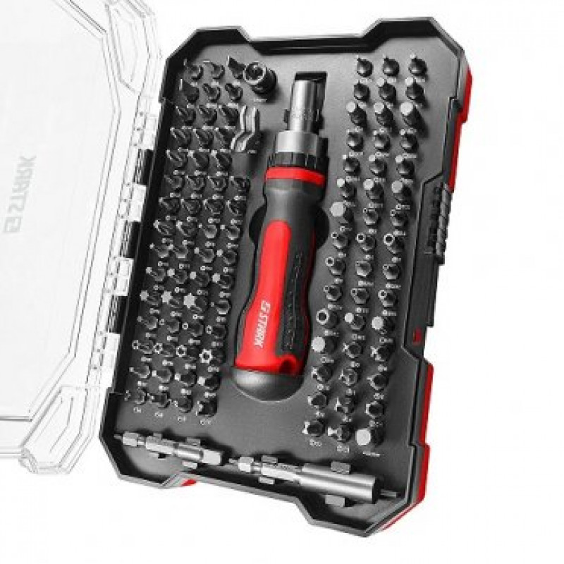 Викрутка реверсивна з набором біт Stark SBKIT-105 - універсальний набір, який включає в себе реверсивний бітотримач, 102 біти, подовжувач і зручний пластиковий кейс з прозорою кришкою. Серед біт є зручна довгаста насадка для закручування гачків.