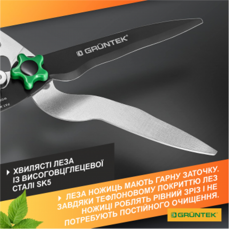 Лезо Gruntek Marabu виготовлено з міцної високовуглецевої сталі SK5, яка рівно ріже гілки і листя. Тефлонове покриття запобігає налипання соку і самих гілок на лезі, що збільшує якість зрізу і значно полегшує очищення ножиць після роботи.
