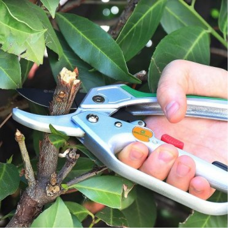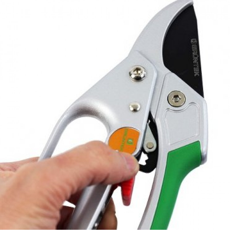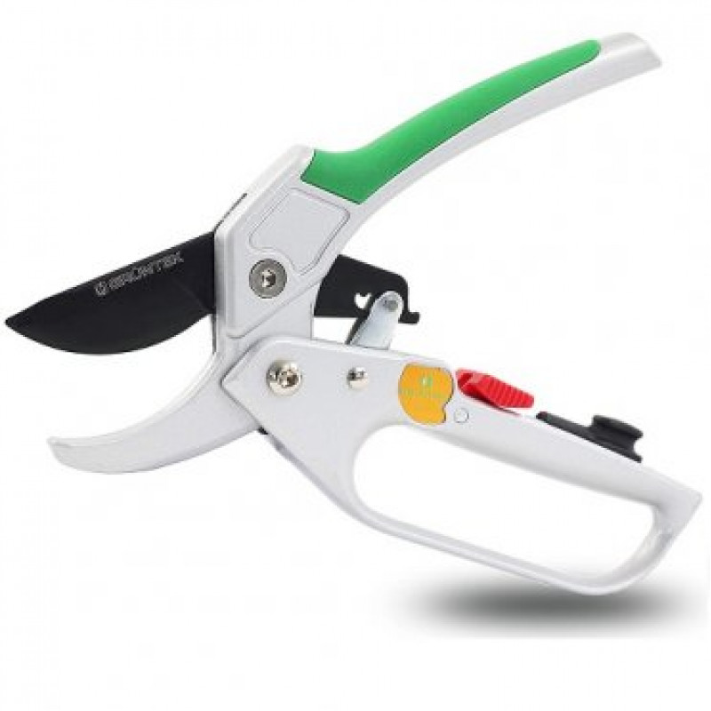 Леза виготовлені з ввисокоуглеродістой стали SK5, а для швидкої і якісної роботи верхнє лезо покрите шаром від налипання. Завдяки наковаленкою секатором можна обробляти міцні гілки. 2-х режимний храповий механізм з автоматичним перемиканням дозволяє різати як дрібні гілки, так і товсті сухі гілки з меншим зусиллям.