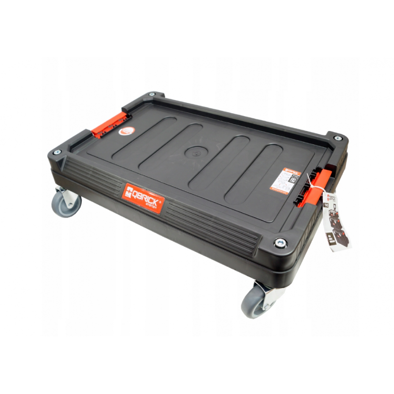 Qbrick System TWO Транспортная платформа оснащена двумя поворотными колесами с тормозом и двумя поворотными колесами без тормоза.