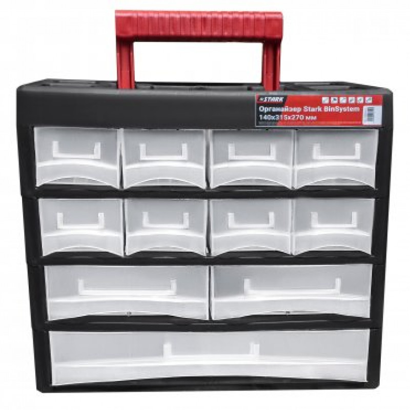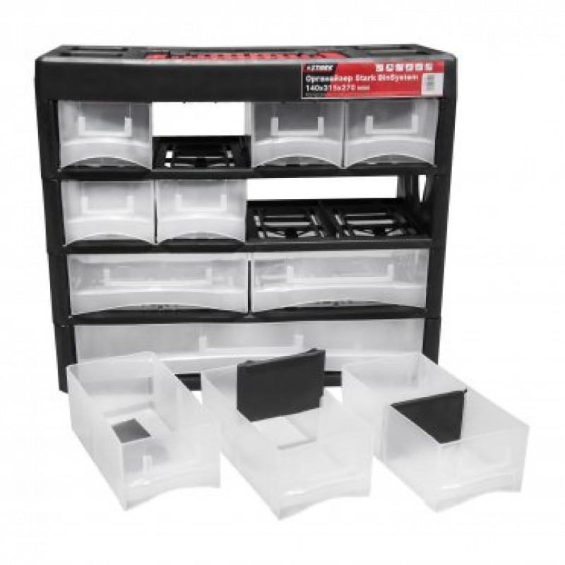 Органайзер для інструментів Stark BinSystem 140x315x270 мм – система для зручності зберігання дрібних деталей, кріплень, інструментів та інших невеликих предметів. Включає 11 висувних скриньок, які можна за бажанням користувача розділити спеціальними вставними перегородками (входять до комплекту).