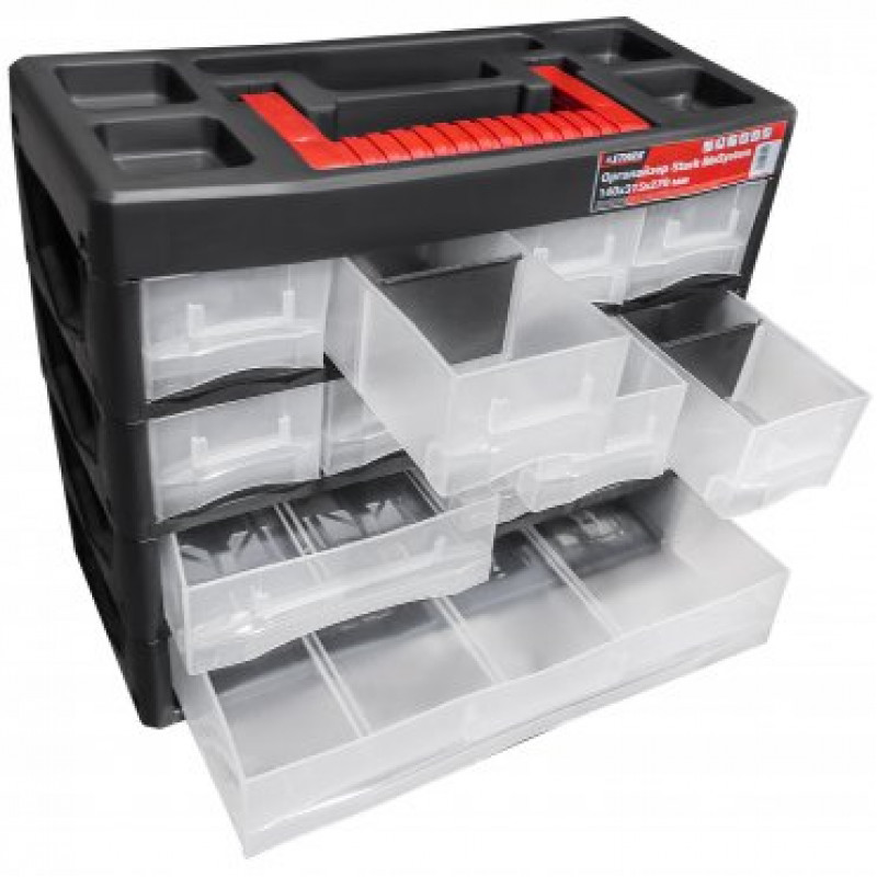 - Вгорі на кришці органайзера розташована зручна складна ручка – для простого транспортування всієї системи зберігання.