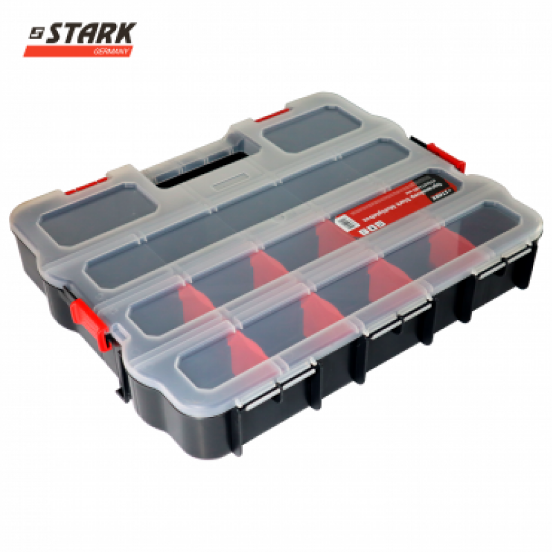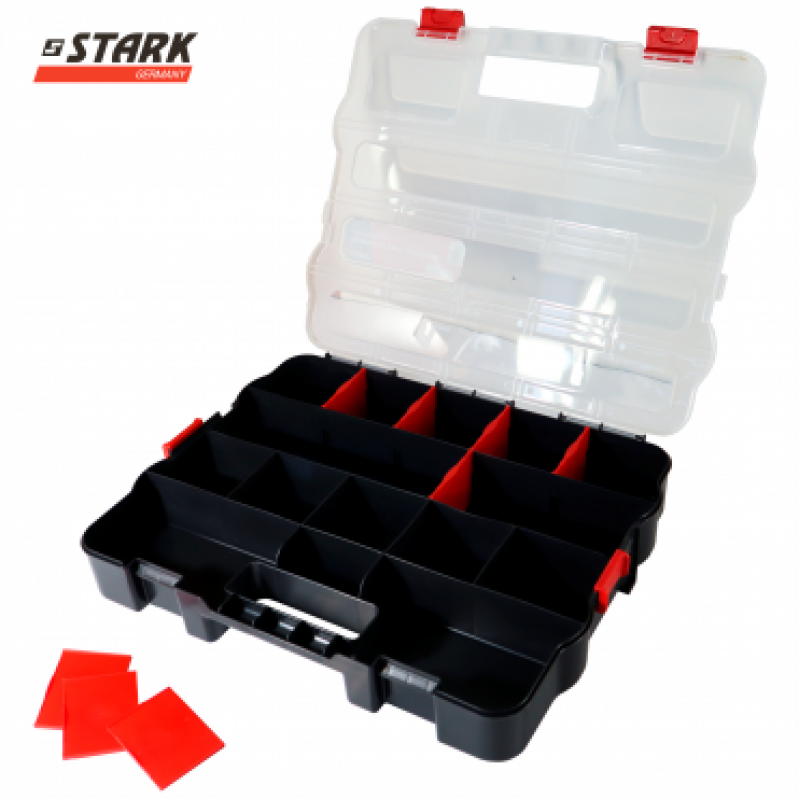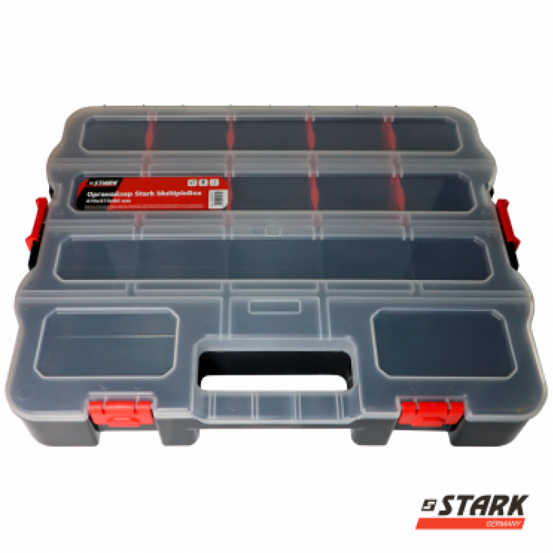 Органайзер Stark MultipleBox 470x373x80 мм – система зберігання дрібних деталей, кріплень, інструментів та інших невеликих предметів. Має форму кейсу. Усередині знаходяться довгі відсіки, які користувач на свій розсуд може розділити спеціальними перегородками (входять до комплекту постачання).