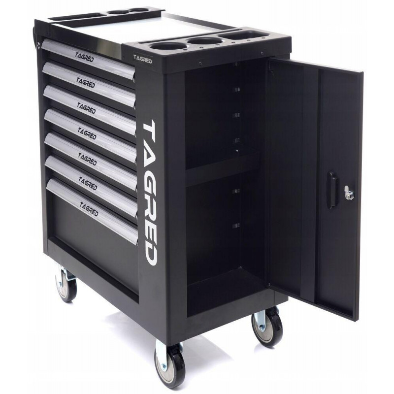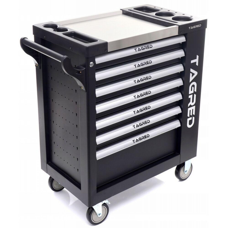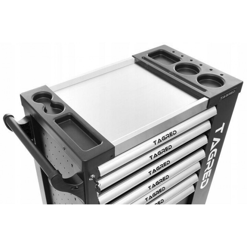 Візок для майстерні TAGRED TA213 з 7 висувними ящиками на кулькових підшипниках і сталевою стільницею відмінно підійде для зберігання інструменту у професійній майстерні, на автосервісі чи у власному гаражі. Велика місткість дозволяє зручно розташувати інструменти, а міцні матеріали виготовлення і додатково укріплені кути забезпечують довготривалу, надійну службу.