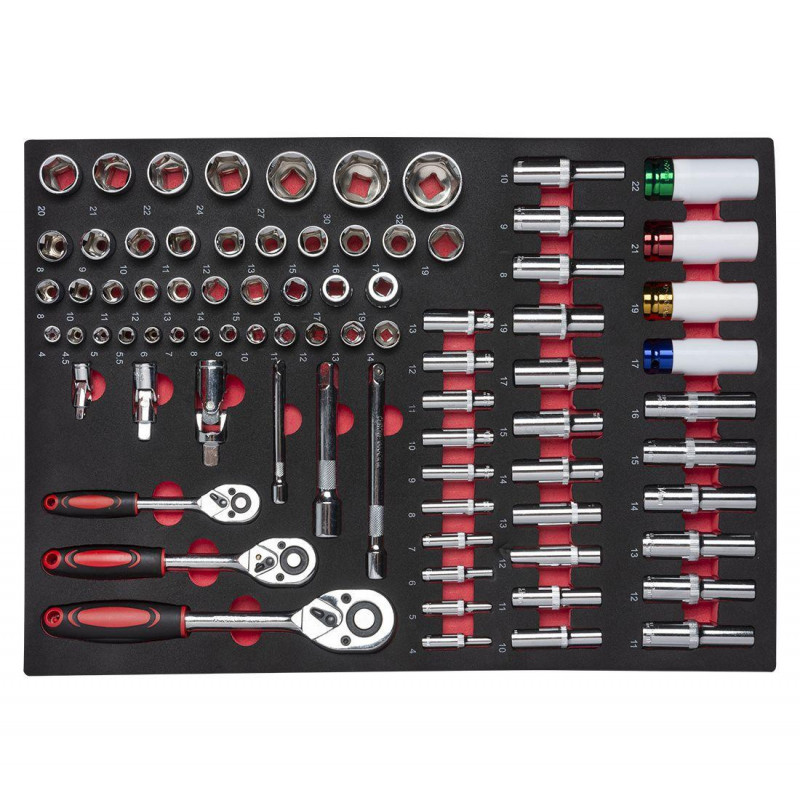 Візок з інструментом REDATS 7+2 стане відмінним придбанням для будь-якої ремонтної майстерні, адже він зручний, надійний і повністю укомплектований необхідним для робіт інструментом у кількості 258 одиниць. 7 містких ящиків з шарикопідшипниковими висувними механізмами легко відкриваються, тому ви швидко отримаєте доступ до потрібних інструментів. Поролонові ложементи запобігають зміщенню інструментів під час транспортування, а центральний замок дозволяє одним рухом закрити всі ящики. 2 перфоровані стінки, одна з яких висувна, а друга - бічна і закривається металевими дверцятами, дають змогу зберігати під рукою часто використовуваний інструмент.