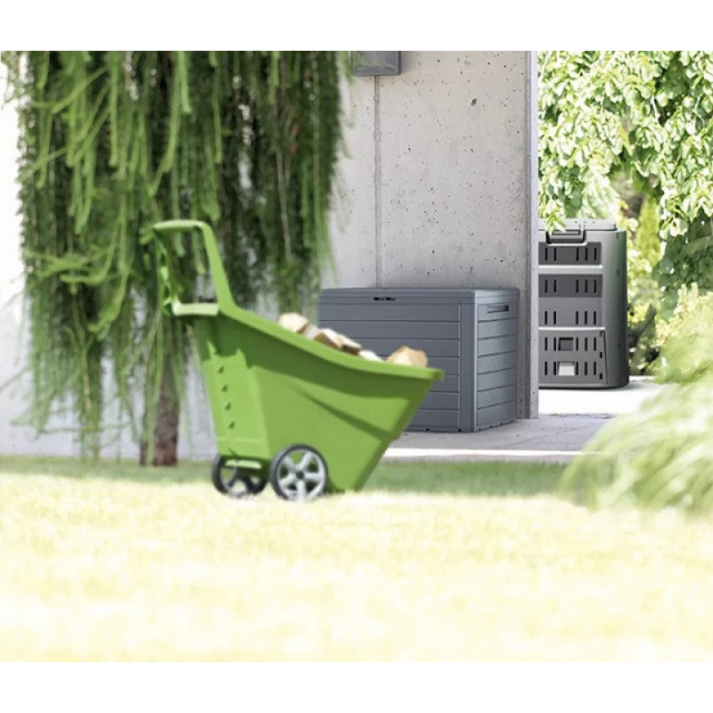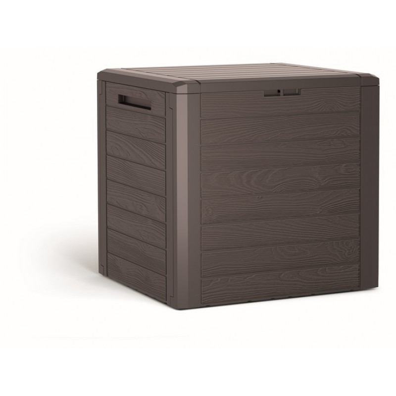 Ящик для зовнішнього зберігання PROSPERPLAST WOODEBOX 140 л, коричневийМультифункціональний ящик Prosperplast Woodebox 140 для зовнішнього/внутрішнього зберігання садового інвентарю, подушок, іграшок, тощо. Додатковими перевагами є легке складання, а також наявність ручок для перенесення з двох боків. В конструкції кришки передбачені петлі для замка. Завдяки своїй конструкції він захищає речі від вологи та бруду. Садова ящик-скринька виготовлена з надміцного пластику, який стійкий до UV променів.Стильний дизайн завжди підкреслить і принесе свіжість у будь-який інтер'єр, а імітація скрині з натурального дерева додає елегантності кожному садовому дворику. Скриня не вимагає додаткового обслуговування і дуже проста в зборі та чищенні.