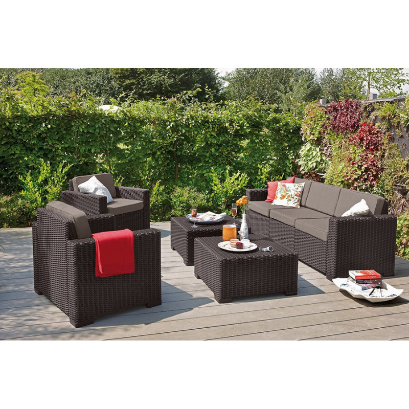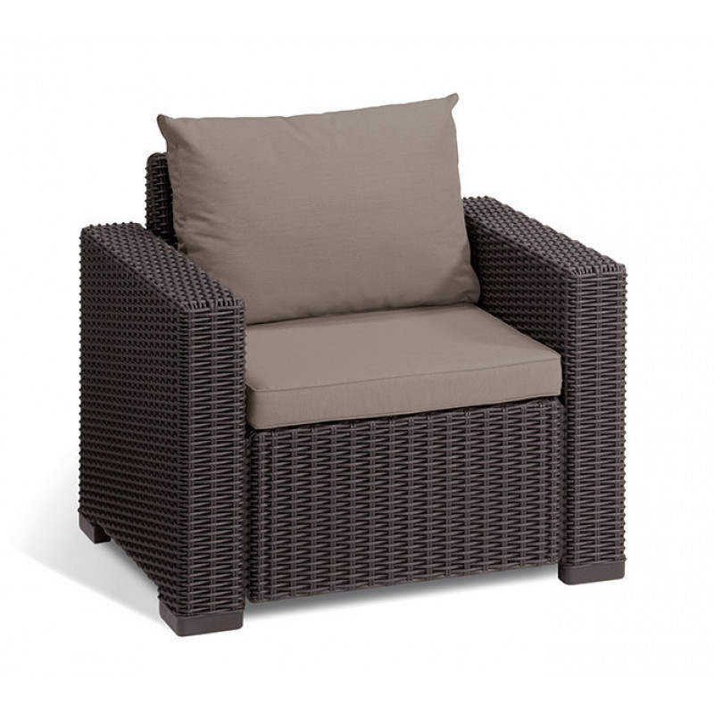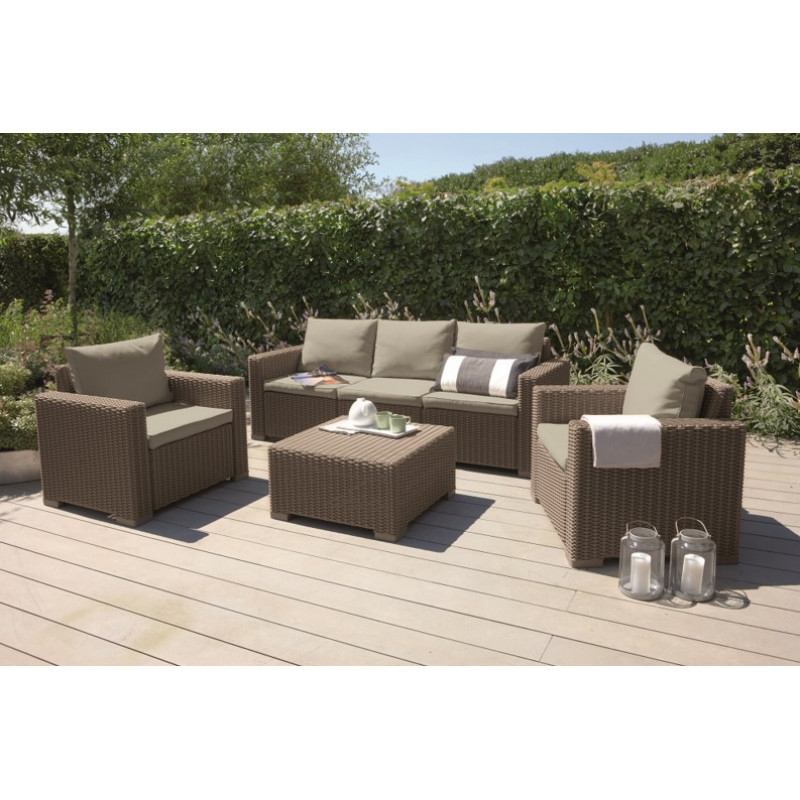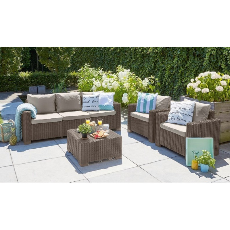Комплект садових меблів Keter California 3 Seater — стильне та практичне рішення для облаштування зон відпочинку на відкритому повітрі. Підходить для терас, балконів, садів, зон біля басейну, а також для комерційного використання — у кафе, готелях та лаунж-зонах. Плетена текстура з пластику (поліротанга) імітує натуральний ротанг, водночас зберігаючи стійкість до вологи, ультрафіолету, грибка й перепадів температур. У комплект входять диван, два крісла та столик з великою корисною площею та внутрішнім простором для зберігання. М’які подушки роблять відпочинок особливо комфортним, а знімні чохли дозволяють легко доглядати за тканиною. Установка не потребує інструментів, збірка інтуїтивно зрозуміла. Ергономіка сидінь і спинок продумана для тривалого відпочинку, а відсутність металевих елементів виключає корозію та робить комплект довговічним і простим у догляді. Усі матеріали безпечні для людини та довкілля. Keter California — це ідеальний баланс між естетикою, практичністю та комфортом.Особливості Сучасний ергономічний дизайн із міцною конструкцією та анатомічною формою спинок і сидінь; Вологозахищений і термостійкий поліпропілен не іржавіє, не потребує фарбування й стійкий до сонячного світла; Підходить для приватних і комерційних просторів, зокрема терас, веранд і готельних зон відпочинку; Зручні сидіння з м’якими подушками (у комплекті 10 шт.), чохли знімаються та придатні до прання; Максимальне навантаження на крісло та місце дивана — 110 кг, на стіл — 30 кг; Інтуїтивна збірка без інструментів, легко демонтується для зимового зберігання; Комплект не потребує догляду: легко миється, не вицвітає та зберігає вигляд роками; Постачається в міцному пакуванні, зручному для зберігання та транспортування.