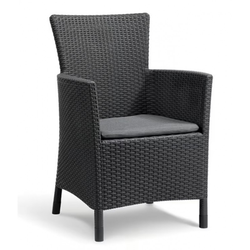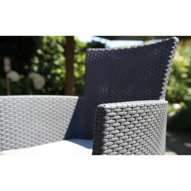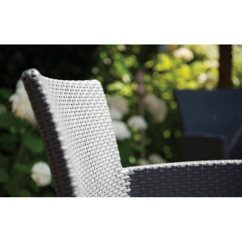 Комплект садових меблів Keter Rosario Balcony Set — це елегантне та зручне рішення для облаштування невеликого відкритого простору. Набір включає два крісла з подушками та квадратний столик, виконані з текстурою під ротанг. Матеріал стійкий до ультрафіолету та вологи, не вицвітає на сонці й не потребує спеціального догляду. Ергономічна форма крісел забезпечує комфорт, а компактні розміри дозволяють розмістити комплект навіть на невеликому балконі чи терасі. Rosario Set чудово підходить для ранкової кави, вечірніх посиденьок і відпочинку на свіжому повітрі.Особливості Стильне оздоблення під ротанг створює затишну атмосферу та гармонійно вписується в будь-який екстер’єр; Міцний пластик каркасу стійкий до ультрафіолетового випромінювання та не піддається корозії й гниттю; Крісла комплектуються м’якими подушками, що підвищує комфорт при тривалому сидінні; Розміри столу 59×59×43 см і крісел 62×60×89 см роблять комплект зручним для невеликих просторів; Максимальне навантаження на крісло — до 110 кг, що забезпечує міцність і стабільність конструкції; Невелика вага (усього 12.8 кг) і компактне пакування (60×80×50 см) спрощують транспортування та зберігання; Легко миється — достатньо вологої ганчірки або струменя води зі шланга; Проста збірка без додаткових інструментів, усе необхідне входить у комплект поставки.Варіанти використання Ідеально для облаштування балкона, лоджії чи тераси в міській квартирі; Підходить для затишної зони відпочинку в саду, біля басейну чи у дворі приватного будинку; Практичне рішення для дачі, особливо за обмеженого простору; Набір пластикових меблів можна використовувати на верандах кафе, у мініготелях, зонах очікування або відпочинку; Легка конструкція дозволяє швидко перемістити меблі в потрібне місце — чудовий варіант для сезонного розміщення.