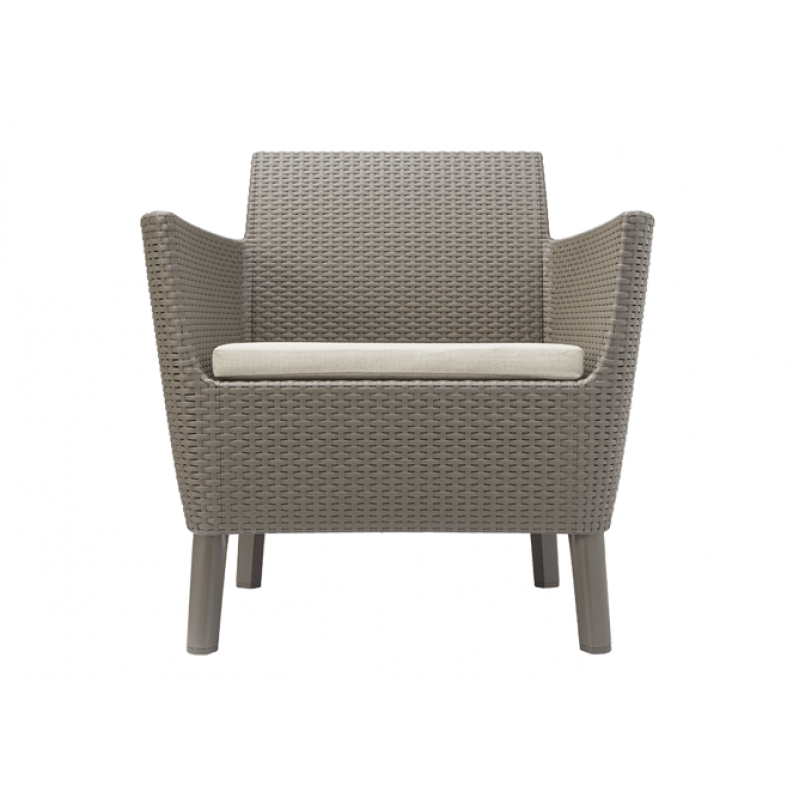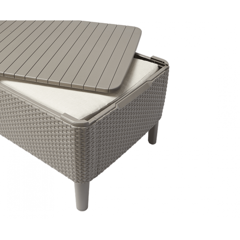 Меблі не піддаються іржавінню та гниттю завдяки неметалічній рамі. Матеріал набору включає водонепроникну обробку, а також стійкий до УФ-випромінювання — колір не вигорає й не тьмяніє. Комплект садових меблів Keter Salemo 3 seater set захоплює витонченою обробкою, стилізованою під плетений ротанг, та міцною і легкою у догляді конструкцією із пластику, що має високу зносостійкість.