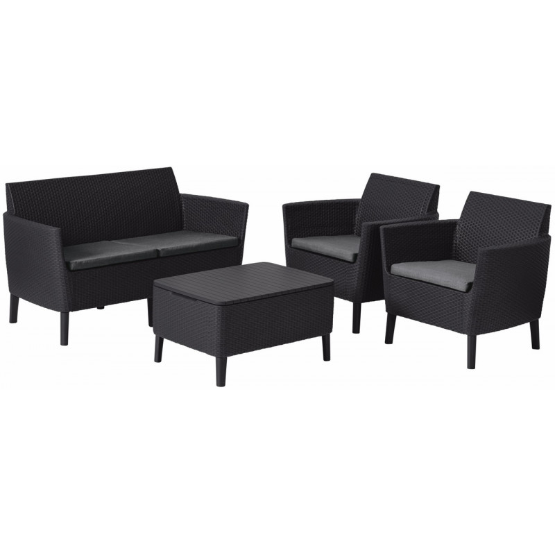 Комплект садових меблів Keter Salemo set в елегантному відтінку капучино — це практичне й естетичне рішення для організації зони відпочинку на терасі, балконі або в саду. Виготовлений із міцного пластику з текстурою під ротанг, комплект не боїться вологи, сонячного проміння й не потребує складного догляду. Меблі розраховані на комфортне розміщення до чотирьох осіб. Зручні подушки та продумана ергономіка забезпечують максимальний комфорт. Стіл-скриня з кришкою — не лише стильний елемент, а й практичне місце для зберігання подушок, пледів та інших аксесуарів. Меблі легко збираються, відзначаються довговічністю та надійністю.Особливості Корпус виготовлений із високоякісного пластику з імітацією ротангового плетіння, стійкого до погодних умов; У комплект входять два крісла, двомісний диван і стіл із відсіком для зберігання речей; Усі елементи мають міцну конструкцію та витримують навантаження до 110 кг на посадкове місце; Зручні подушки в комплекті забезпечують додатковий комфорт під час тривалого сидіння; Колір меблів — капучино з піщаним відтінком — чудово поєднується з природним оточенням та іншими елементами екстер’єру; Меблі не вицвітають на сонці й не схильні до корозії, оскільки не містять металевих елементів; Комплект легко збирається без додаткових інструментів і підходить для самостійного встановлення.Варіанти використання Створення затишної зони відпочинку на дачі, в саду або на терасі для всієї родини та гостей; Організація комфортної лаунж-зони в кафе, на верандах або біля басейну; Зберігання подушок та інших речей у столику-скрині для економії простору; Використання в умовах постійного перебування на вулиці завдяки стійкості до УФ-променів і вологи; Набір пластикових меблів можна використовувати в житлових комплексах, на базах відпочинку та в літніх ресторанах як функціональні та презентабельні меблі.