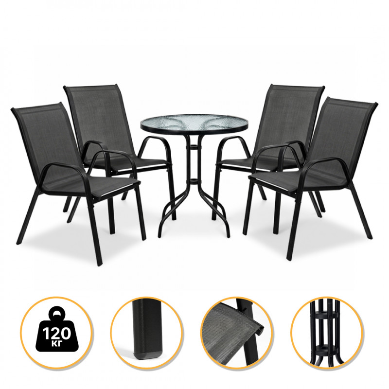 - Повноцінний комплект — 4 зручні крісла та компактний круглий столик