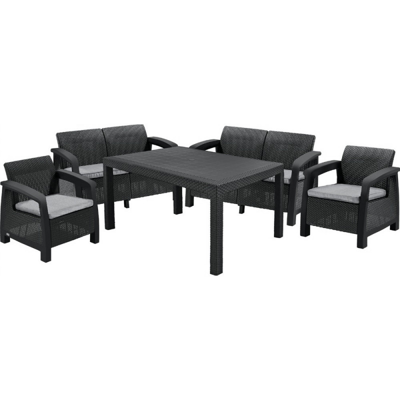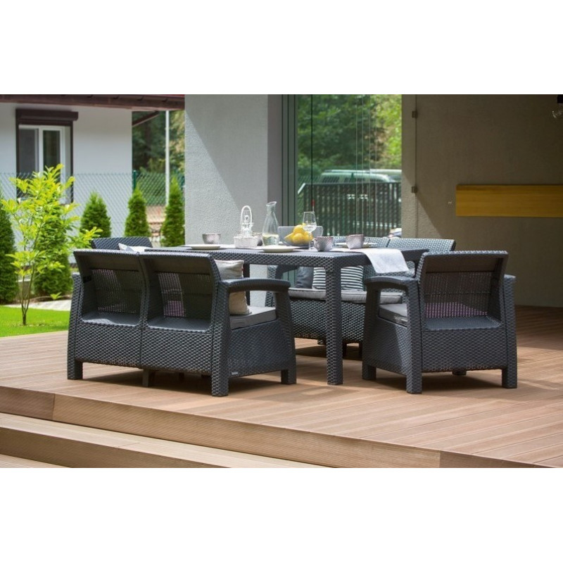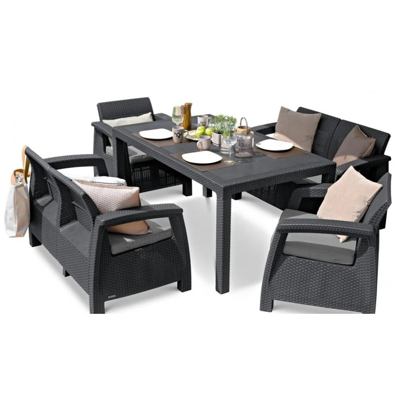 Набір садових меблів Keter Corfu Fiesta — це стильне й просторе рішення для облаштування зони відпочинку на дачі, терасі або в саду. Комплект розрахований на шість осіб і включає два дивани, два крісла та прямокутний стіл. Завдяки імітації плетіння ротанга та насиченому графітовому кольору меблі виглядають сучасно й естетично. Усі елементи виготовлені з міцного поліпропілену, стійкого до вологи, УФ-випромінювання та механічних пошкоджень. Подушки із сірими знімними чохлами забезпечують додатковий комфорт. Комплект легко збирається, не потребує складного догляду й чудово зберігає зовнішній вигляд при використанні просто неба.