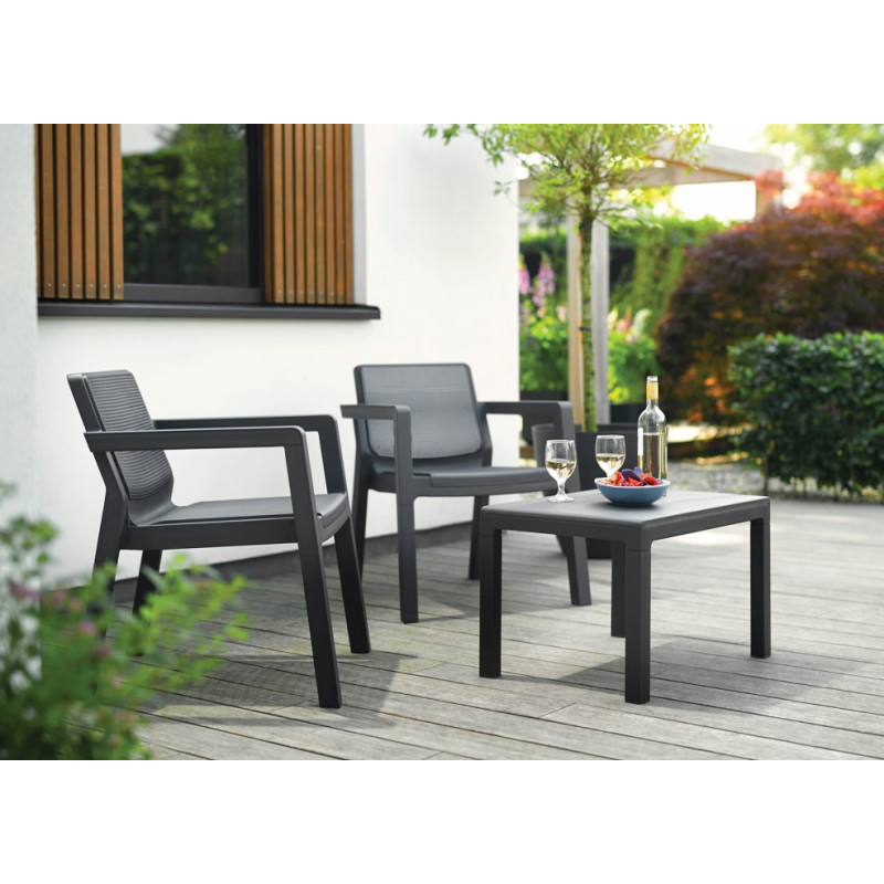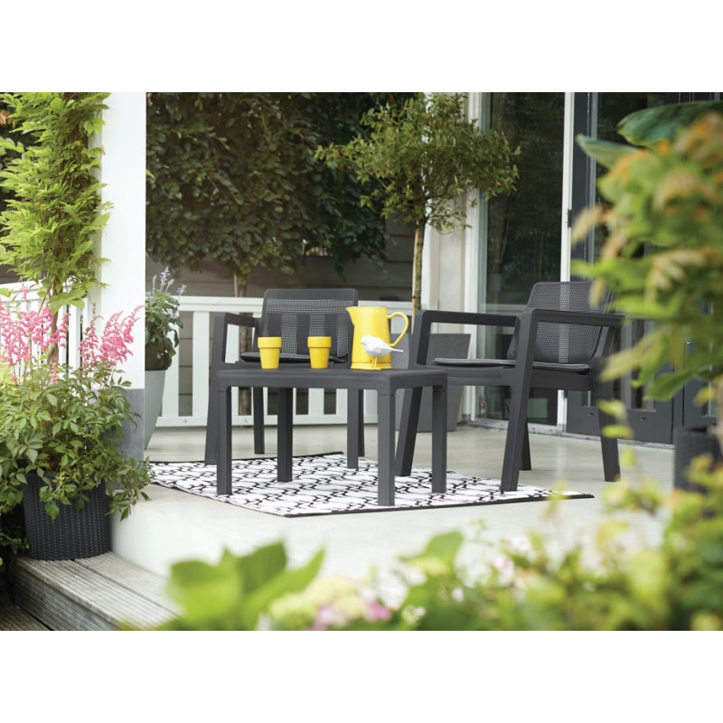 Набір меблів Keter Emily Balcony set — це компактний і практичний комплект, ідеально підходить для балконів, терас, невеликих садів і патіо. До набору входять два крісла з м’якими подушками та прямокутний стіл. Виготовлений із міцного поліпропілену графітового кольору, стійкого до погодних умов, УФ-випромінювання, вологи й забруднень. Набір вирізняється стильним сучасним дизайном, ергономічною формою сидінь і високою міцністю. Він легко збирається без інструментів, не потребує спеціального догляду й довго зберігає первинний вигляд навіть при використанні на вулиці.Особливості Міцний і легкий корпус із поліпропілену стійкий до корозії, вологи та сонячного випромінювання, що гарантує довгий термін служби меблів на відкритому повітрі; Крісла мають ергономічну форму, що забезпечує зручну посадку, та оснащені м’якими подушками для додаткового комфорту; Прямокутний стіл має стійку конструкцію та витримує до 50 кг навантаження в центрі та 20 кг по краях; Сучасний дизайн у графітовому кольорі чудово поєднується з будь-яким екстер’єром — від балкона до заміської ділянки; Легка вага (усього 11 кг) і компактні розміри роблять комплект зручним для переміщення й зберігання; Постачається в картонній коробці розміром 70×70×54 см, загальна вага з пакуванням — 14 кг; Проста збірка без використання інструментів — усі елементи з'єднуються вручну згідно з інструкцією;Варіанти використання Підходить для балконів і терас у міській квартирі завдяки компактним розмірам і стильному дизайну; Може використовуватись як зона відпочинку в саду або дворі приватного будинку; Комплект пластикових меблів підходить для розміщення в зонах очікування, лаунж-зонах, літніх кафе та мініготелях; Зручний для сезонного використання — легко переноситься та швидко розбирається для зберігання в холодну пору року; Створює затишний простір для ранкової кави, вечірнього чаю або відпочинку на свіжому повітрі.