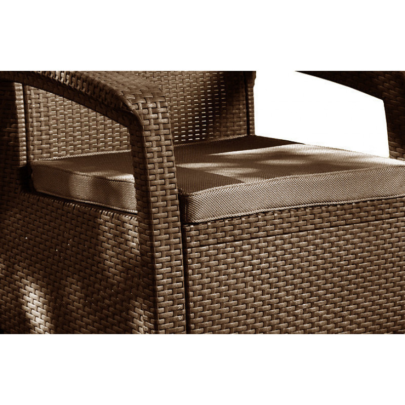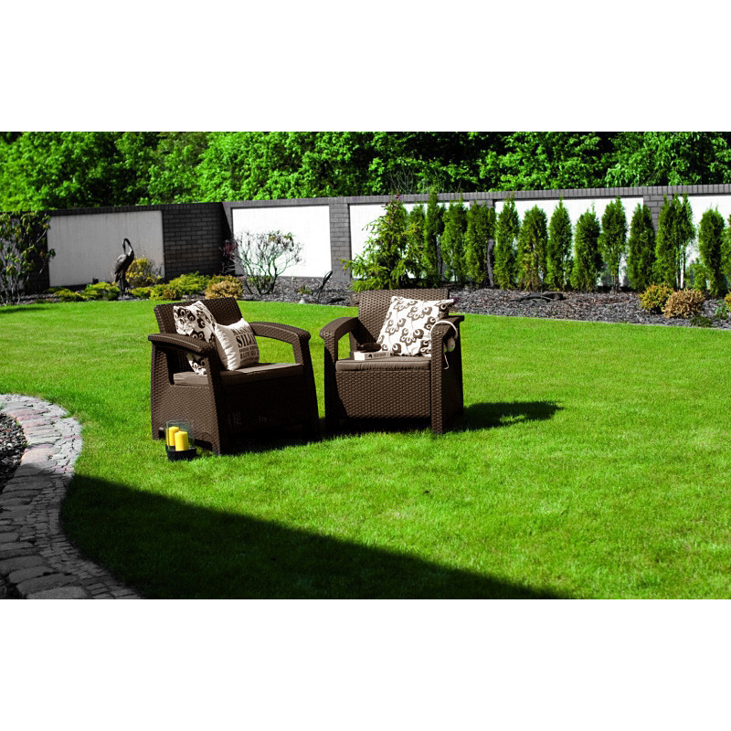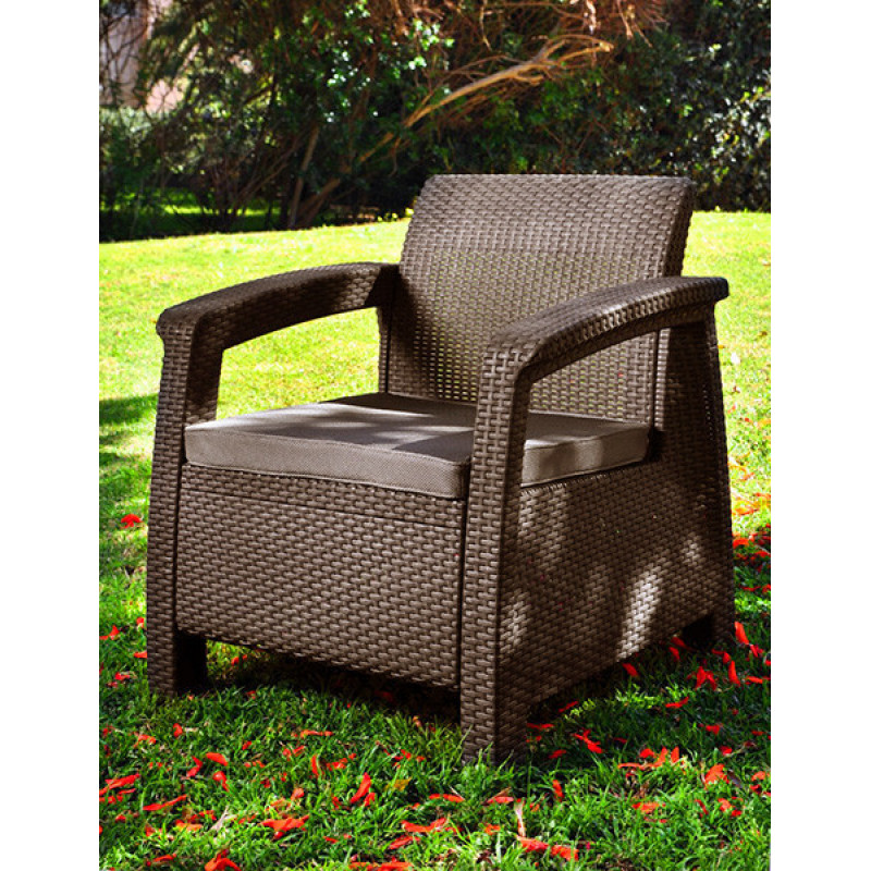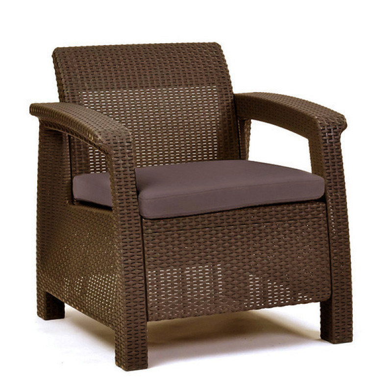 Крісло садове пластикове Keter Corfu, коричневеКрісла виконані з пластика, що імітує штучний ротанг в двох кольорах - коричневому і сірому. Більше того, ви зможете так само купити декоративне кашпо, скриня, і все це буде виконано в одному стилі.ПеревагиЕргономічний дизайнЗроблено з міцного пластикуНеметалева рама - не іржавіє і не гниєЛегка збіркаЗавдяки стійкому до високих температур поліпропілену, кольори не вигорають і не бліднутьБренд: Allibert® (Нідерланди);Матеріал: штучн. ротанг (пластик, поліпропілен);Колір: коричневий;Розмір: 75*70*79 смВага: 7,3 кгМакс. навантаження: 110 кгРозмір упаковки (Д*Ш*В): 60x80x35 см Варіація кольору:Сірий
