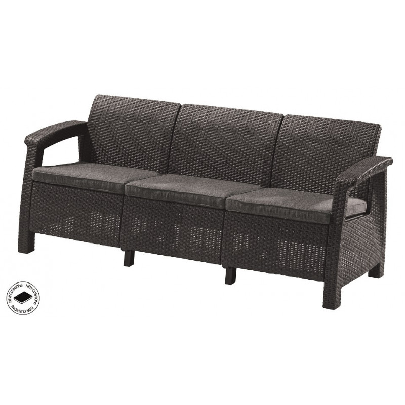 Софа садова пластикова Keter Corfu love seat max, сіраБренд: Allibert (Нідерланди)Матеріал: пластик, поліпропілен; імітація ротангаКолір: сірийРозмір софи (ДхШхВ): 182x70x79 см.Вага: 17,5 кгМакс. навантаження: 110 кг (на одне посадкове місце)Розмір упаковки (ШхВхГ): 120х42х80 см.Вага в упаковці: 19,0 кгКомплектація:- софа - 1 шт.;- подушки - 3 шт.Гарантія: 6 місяцівТримісний диван (розкладається) Corfu love seat виготовлена з високоякісних матеріалів. Меблі ідеально гармонують з іншими елементами стильної колекції - кріслами і тримісним диваном, завдяки чому можливі довільні модифікації оформлення площ. Невеликі розміри дозволять оптимально облаштувати невеликі тераси, внутрішні дворики-патіо, балкони або сади.Софа Corfu love seat в модному сьогодні стилі дуже проста в монтажі і легко утримувати в чистоті. Стійка до впливу несприятливих атмосферних умов і ультрафіолетових променів.