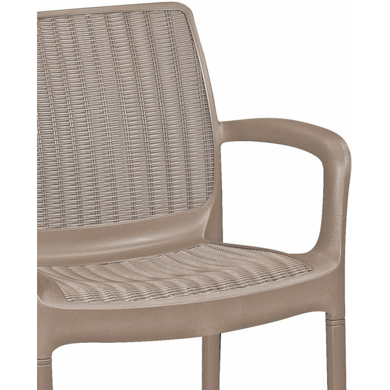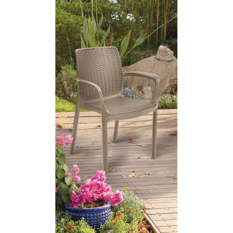 Стілець садовий пластиковий Keter Bali, бежевийБренд: Keter® (Ізраїль)Матеріал: фактурне плетіння пластику, що імітує ротангКолір: бежРозмір стільця (Д*Ш*В): 55*60*83 смВага: 3,30 кгМакс. навантаження: 110 кгРозмір упаковки (Д*Ш*В): 55*60*83 смГарантія: 24 місяціСтілець Bali - це універсальний стілець з підлокітниками, який поєднує в собі стійку конструкцію і елегантність виконання. Модель ідеально підходить як для саду, терас, балконів, так і послужить доповненням дизайну інтер'єрів. Надійний, міцний та стійкий до впливу погодних умов, УФ-променів. Оригінальне переплетення фактури поверхні є додатковою візуальною перевагою даної моделі.Особливості: закруглена форма спинки