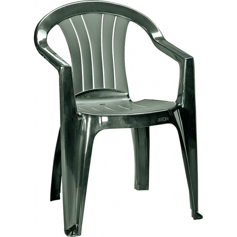 Стілець садовий пластиковий Keter Sicilia, темно-зеленийSicilia – це універсальний стілець, який поєднує в собі комфорт з простим, позачасовим стилем. Ці садові меблі характеризуються легкою і в той же час міцною конструкцією. Стільці можна штабелювати (складати один на інший), що дозволяє економити місце і полегшує їх зберігання. Стійкі до впливу погодних умов і УФ-випромінювання. Легко миються.Особливості: заокруглена форма спинки, огинаючи форми підлокітники.