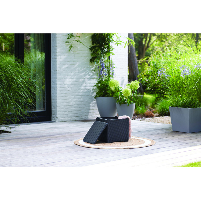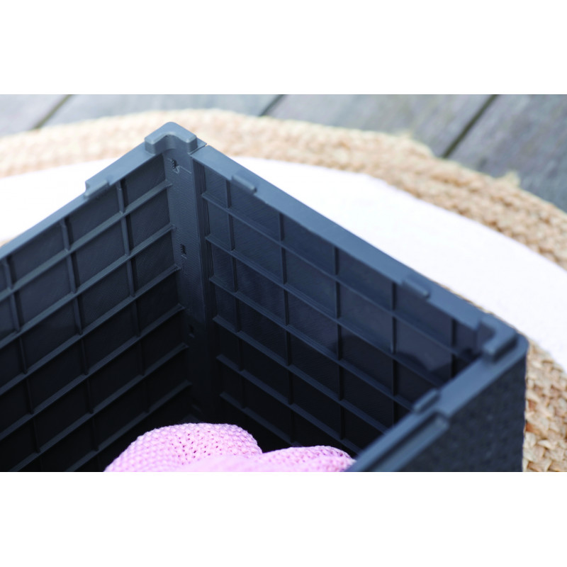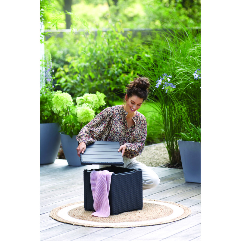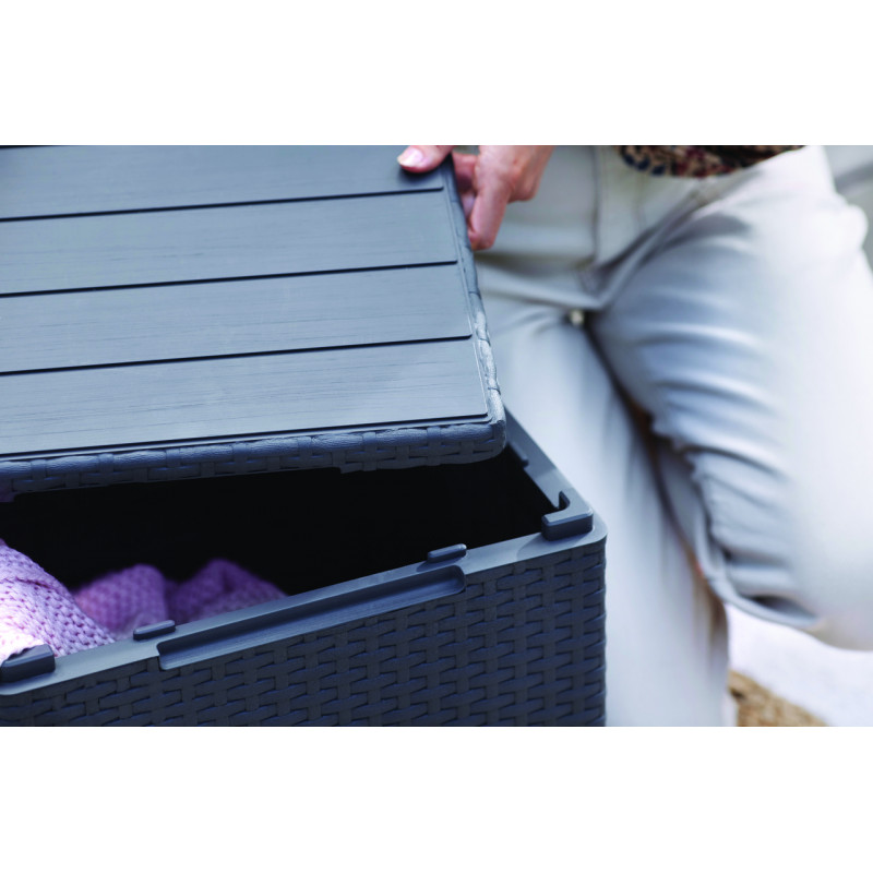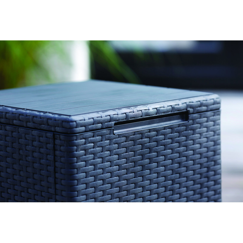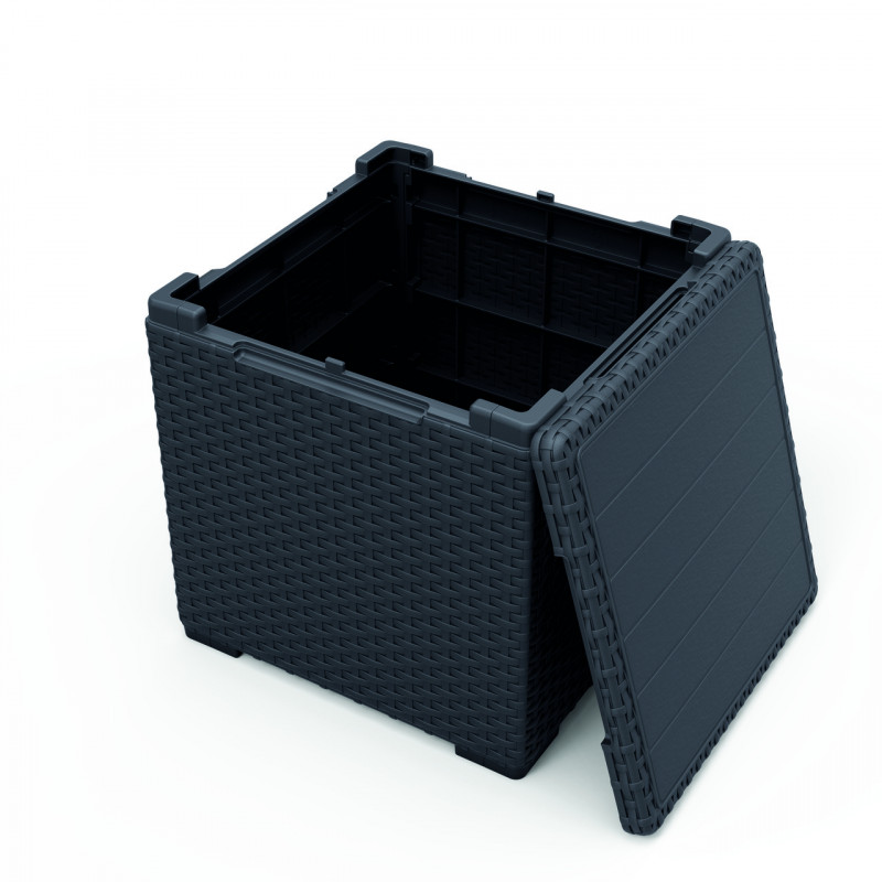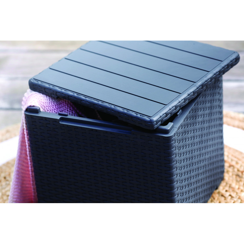 Стіл-скриня Keter Vigo, 50 л у стильному кольорі графіт поєднує у собі зручний та компактний столик з додатковою функцією зберігання. Виріб підходить як для зовнішнього, так і для внутрішнього користування. Це чудовий варіант для саду, тераси, балкону, веранди та універсальне рішення для зберігання речей, що водночас може доповнити будь-який простір, як столик для напоїв та закусок або підставка для декору.Завдяки якості використаних матеріалів виріб поєднує чудову функціональність та ергономічний дизайн. Стіл-скриня не піддається ржавінню та гниттю завдяки неметалічній рамі. Матеріал включає водонепроникну обробку, а також стійкий до УФ-випромінювання - колір не вигорає й не тьмяніє. Стіл-скриня Keter Vigo захоплює витонченою стилізацією під плетений ротанг та міцною і легкою у догляді конструкцією із пластику, що має високу зносостійкість. Монтаж виробу займає мінімум часу і не потребує жодних інструментів!