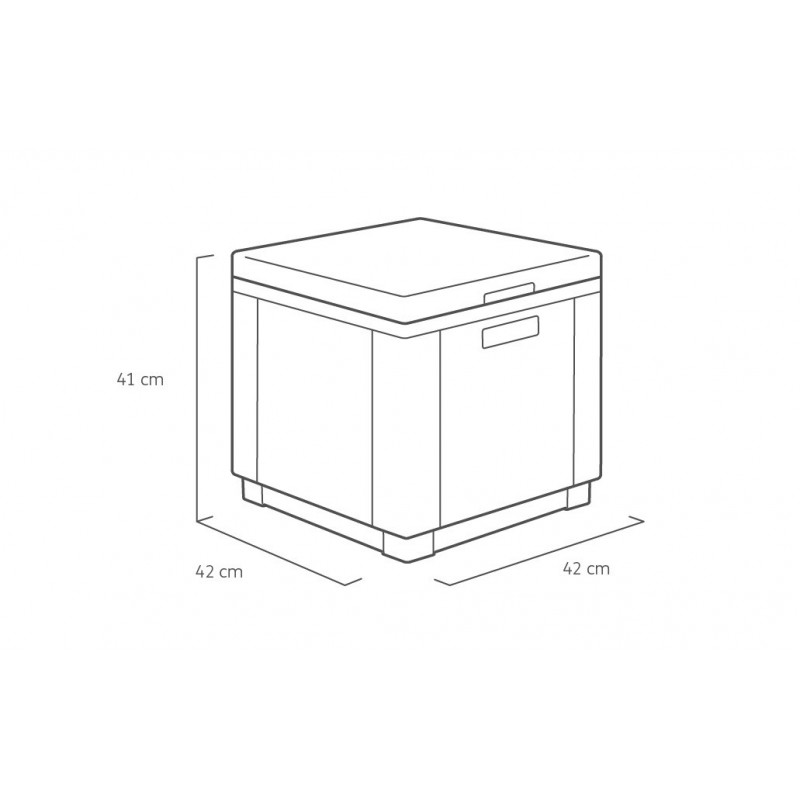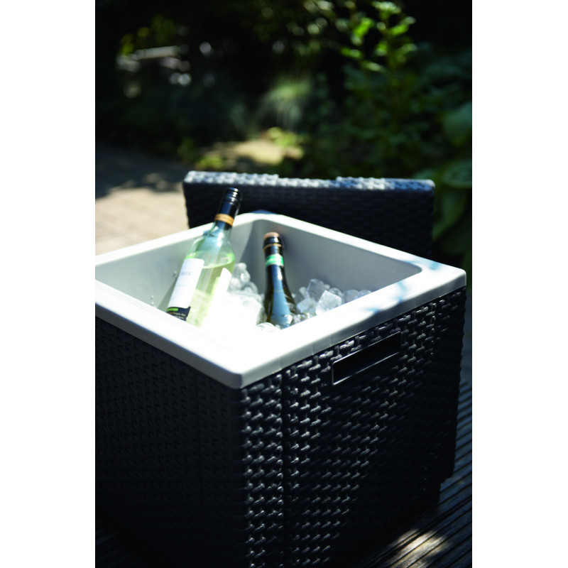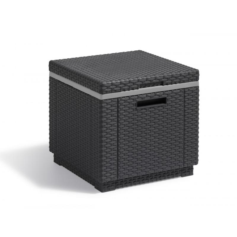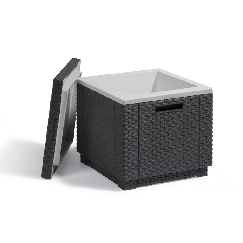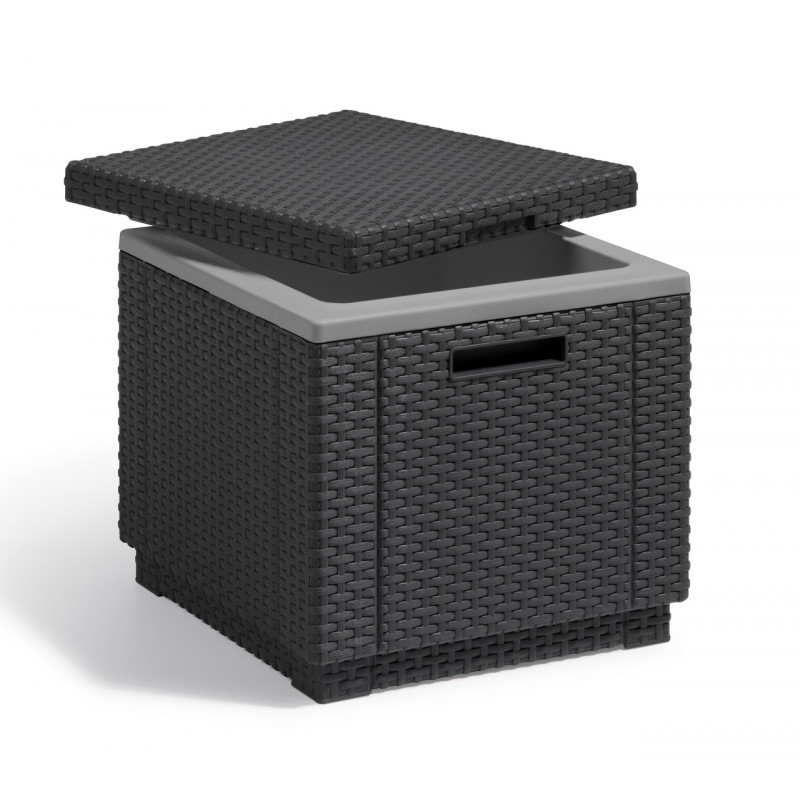 Allibert Ice Cube — це функціональний стіл-скриня з термоізоляцією, який стане ідеальним доповненням для пікніків, вечірок і заміського відпочинку. Виготовлений у графітовому кольорі з фактурою під штучний ротанг, він стильно виглядає та гармонійно поєднується з будь-якими садовими меблями. Стіл витримує навантаження до 110 кг і може використовуватись як додаткове сидіння. Внутрішній відсік об'ємом 33 л із гелевим акумулятором температури дозволяє зберігати прохолоду напоїв і продуктів упродовж кількох годин. Міцний пластик стійкий до вологи та ультрафіолету, не потребує спеціального догляду й не піддається корозії.Особливості Забезпечує термоізоляцію для зберігання охолоджених напоїв і продуктів завдяки вбудованому термоотсеку та акумулятору холоду; Багатофункціональне використання як столика, ящика для зберігання та додаткового місця для сидіння з навантаженням до 110 кг; Сучасний дизайн з оздобленням під штучний ротанг легко вписується в екстер’єр тераси або саду; Компактні розміри та корисний внутрішній об’єм 33 л роблять виріб зручним для виїздів і заходів на відкритому повітрі; Виготовлений із зносостійкого пластику, стійкого до погодних умов, вологи й УФ-випромінювання.