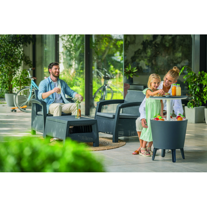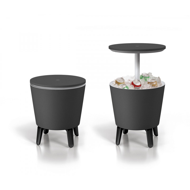 Практичний та оригінальний Стіл-трансформер Keter Cool Bar у стильному кольорі графіт приємно вразить своєю якістю та багатофункціональністю. Виріб підходить як для зовнішнього, так і для внутрішнього використання. Це чудовий варіант для саду, тераси, балкону, веранди, басейну та універсальне рішення у літній період для охолодження продуктів чи напоїв, що водночас може доповнити будь-який простір, як столик для закусок чи підставка для декору.Кришка плавно піднімається вгору і може використовуватися як стільниця. Висота стола-трансформера в складеному вигляді становить 57 см, а з піднятою стільницею 84,5 см. Місткість виробу близько 30 літрів підходить для наповнення кубиками льоду, напоями чи закусками. Cool Bar має подвійну ізоляцію, тому може зберігати прохолоду особливо довго навіть у спекотні дні. Талу воду зручно зливати за допомогою вбудованої пробки на дні виробу.Завдяки якості використаних матеріалів та особливостям конструкції виріб поєднує чудову функціональність та ергономічний дизайн. Стіл-трансформер не піддається ржавінню та гниттю завдяки неметалічній рамі. Матеріал включає водонепроникну обробку, а також стійкий до УФ-випромінювання - колір не вигорає й не тьмяніє. Стіл-трансформер Keter Cool Bar захоплює оригінальним дизайном та міцною і легкою у догляді конструкцією із пластику, що має високу зносостійкість. Монтаж виробу займає мінімум часу.