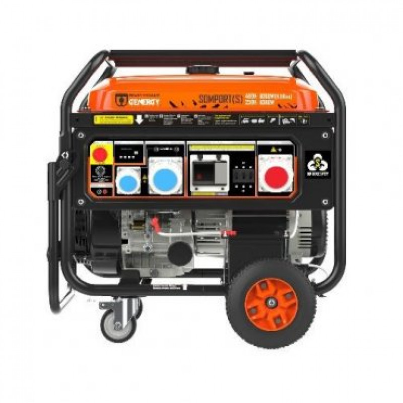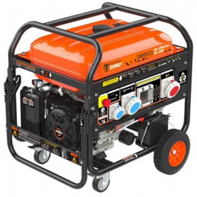 Генератор бензиновий GENERGY SOMPORT 8,3 кВт/9,2 кВт – однофазний та трифазний генератор 230В/400В преміум класу з максимальним захистом від ураження струмом навіть при експлуатації в умовах підвищеної вологості. Підходить для постачання електроенергії до будинків, офісів, будівельних майданчиків, майстерень, кемпінгів і т.д. Здатний забезпечувати роботу електроприладів із сумарною потужністю до 9 кВт (номінальна потужність, напруга 400 В) або до 8 кВт (номінальна потужність, напруга 230 В). Максимальна потужність для даної моделі: 9,2 кВт (400 В) та 8,3 кВт (230 В).