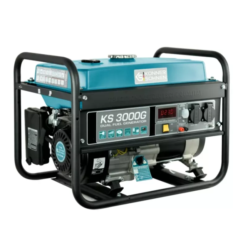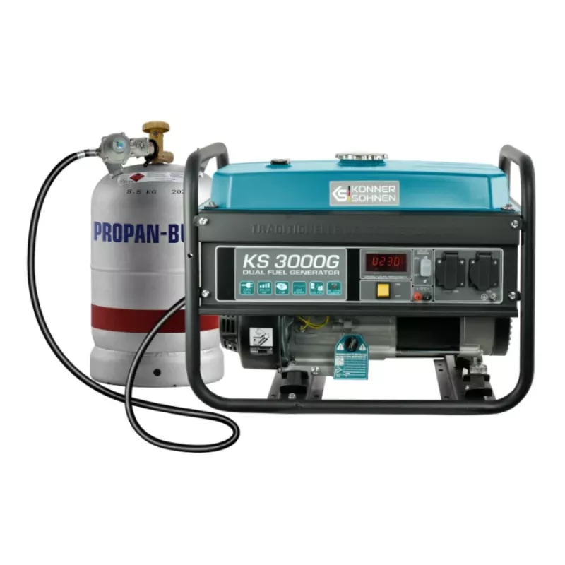 - Газобензинові генератори ТМ «Könner & Söhnen» серії DUAL FUEL на сьогоднішній день найбільш популярні серед покупців через свою економічність та екологічність. Ви можете використовувати генератор як на бензині, так і на зрідженому газі (пропан-бутан). Експлуатація генератора на газу підвищує моторесурс двигуна. Все необхідне для підключення балону йде в комплекті: генератор оснащений регулятором нульового тиску, шлангом з понижуючим редуктором; необхідно тільки під’єднати генератор до Вашого газового балону. Генератор не призначений для підключення до газової магістралі. При необхідності газобензинові моделі легко перемкнути на роботу на бензині. Потужний одноциліндровий 4-х тактний двигун K&S з повітряним охолодженням забезпечує стабільну та надійну роботу генератора.
