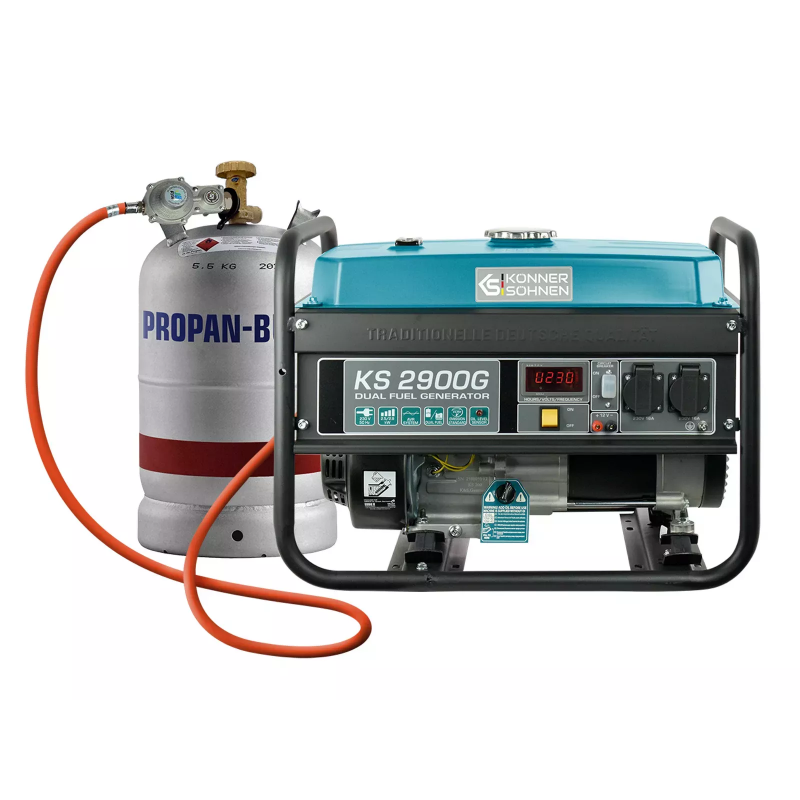 Газобензинові генератори Könner&Söhnen KS 2900G серії DUAL FUEL відрізняються економічністю та екологічною чистотою. Вони функціонують на бензині та зрідженому газі, що надає варіативність використання та продовжує життя двигуна. Пристрої комплектуються необхідними елементами для підключення газового балона, включаючи регулятор тиску та шланг із редуктором.
