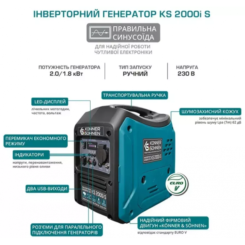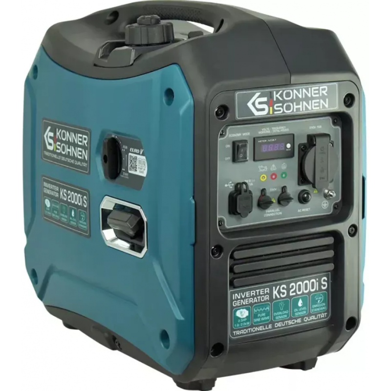 Інверторний генератор Konner&Sohnen KS 2000i S є зручним портативним джерелом електричної енергії, а подвійне перетворення забезпечує максимально стабільну частоту 50 Гц та напругу 230В. Основою генераторної системи виступає 1-циліндровий 4-тактний двигун внутрішнього згоряння з повітряним охолодженням об'ємом 79.7 см.куб. та потужністю 2.5 к.с. Максимальна вихідна потужність, яку здатний видати генератор, становить 2 кВт, номінальна потужність 1.8 кВт. Генератор обладнаний розеткою 220В 16А. Багатофункціональний LED-дисплей дозволяє контролювати роботу генератора – напругу, частоту, навантаження, кількість відпрацьованих годин. 4-літровий паливний бак забезпечує тривалу та безперервну роботу. Так, при 50% навантаження та повній заправці час безперервної роботи генератора становить 6 годин. Генератор має систему ручного старту.
